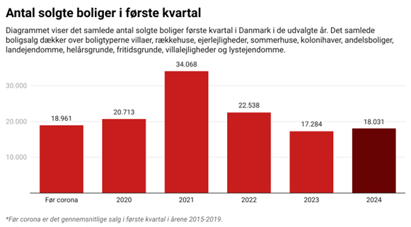 Der blev i alt solgt 18.031 boliger i Danmark i løbet af første kvartal 2024, viser nye handelstal fra Boligsiden.