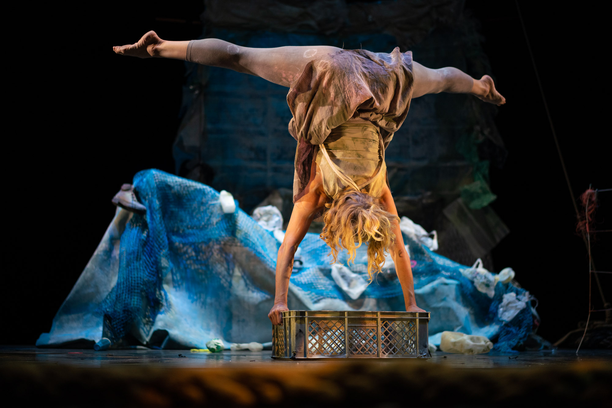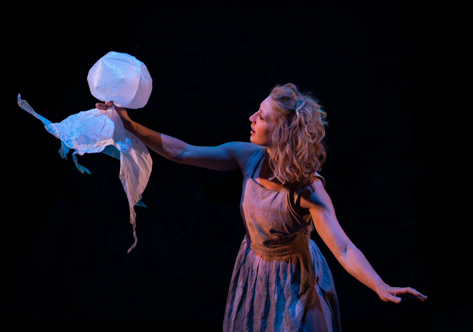 Til forestillingen under Aarhus Festuge er det lokalt indsamlet plast i Aarhus, som udgør Claire Bensons egen særegne plastikscenografi. Fra plastaffald til poetisk scenekunst.