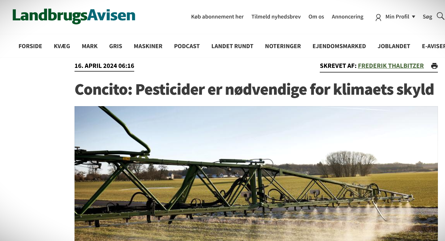 Jorden rystede ved læsning af Landbrugsavisen d. 13. april 2024 (bragt på web 16. april), hvor Concitos seniorkonsulent Tavs Nyord er citeret for at sige: ”Af klimamæssige årsager har vi desværre behov for pesticider”.