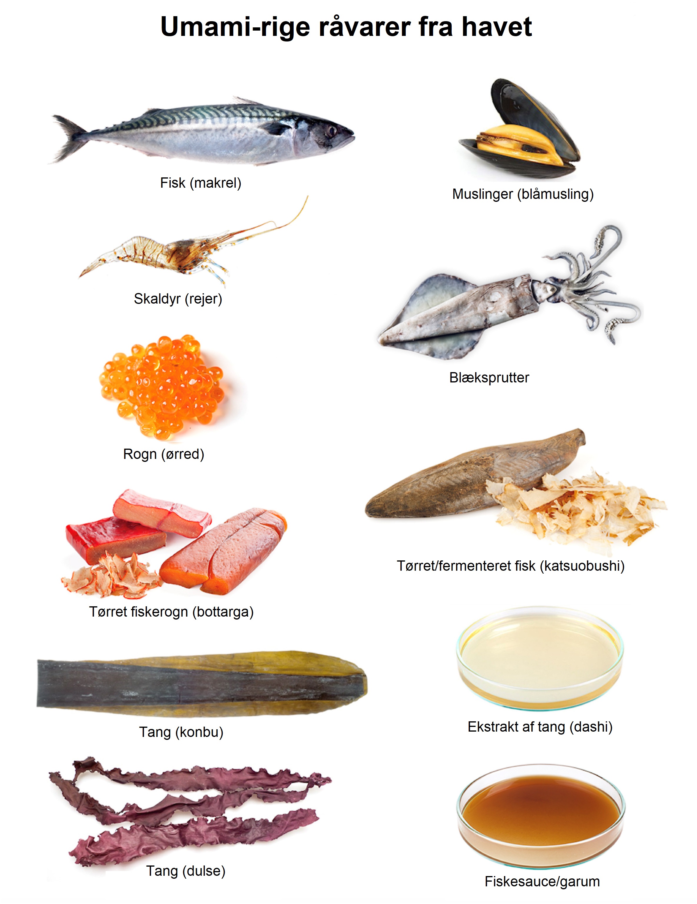 Makrel, blåmuslinger og tang er ifølge udregningerne nogle af de danske råvarer fra havet, der har meget umami i sig. Men listen over ”havmad” med store koncentrationer af umami i sig er lang og tæller lige fra fisk som torsk og laks, skaldyr og bløddyr som rejer, østers og blæksprutter, rogn fra fx sild og fladfisk, forskellige typer af tang til forarbejdede produkter som ansjospasta og fiskesauce.