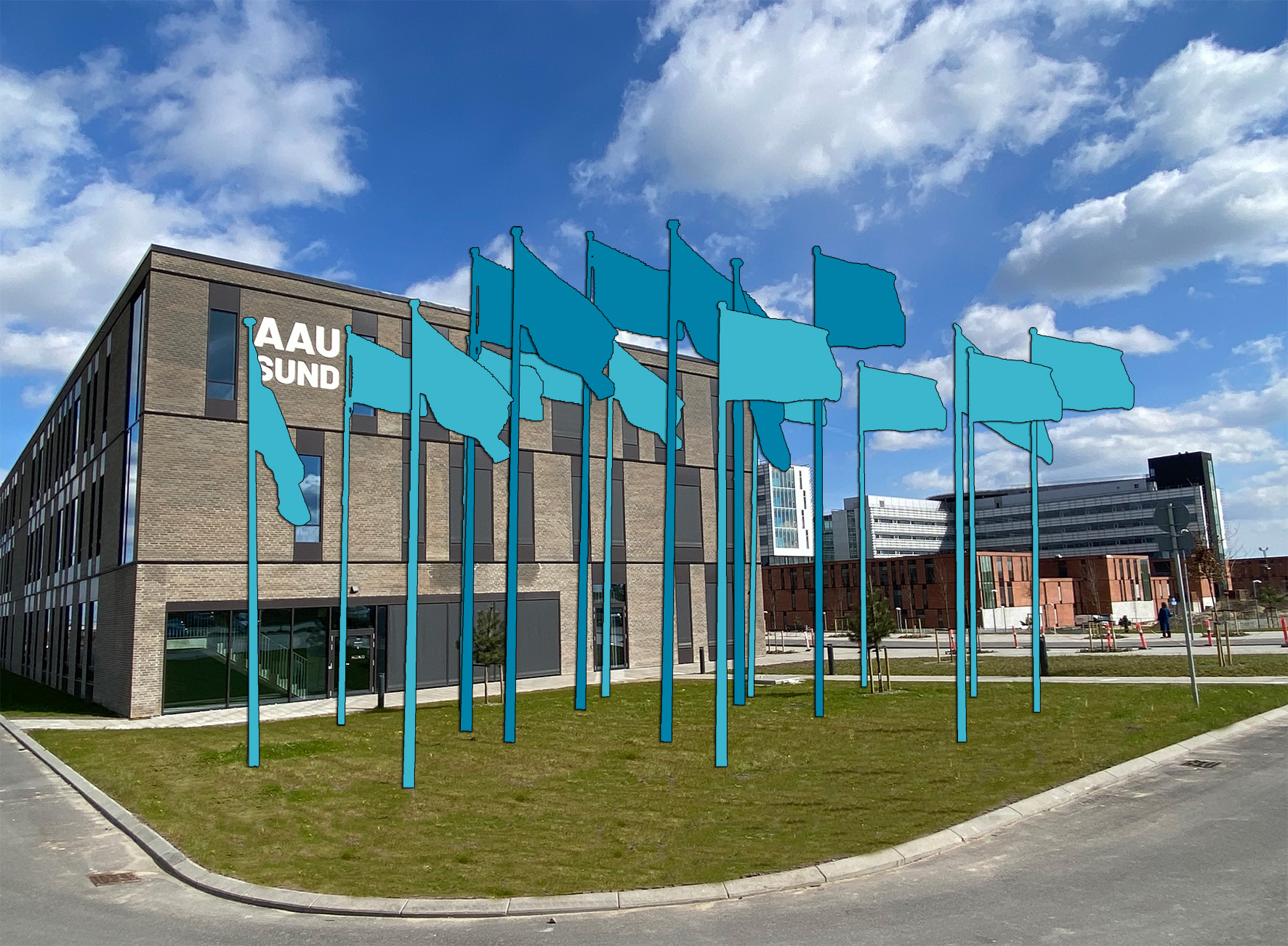 Det drejer sig om Hesselholdt & Mejlvangs værk Flags of Knowledge. Værket består af farvestrålende flagstænger med flag og vindfløje opsat på busstoppesteder. Målet er, at værket skal gøre det lettere at finde rundt på campus, set i lyset af det meget store areal, som universitetet strækker sig over.