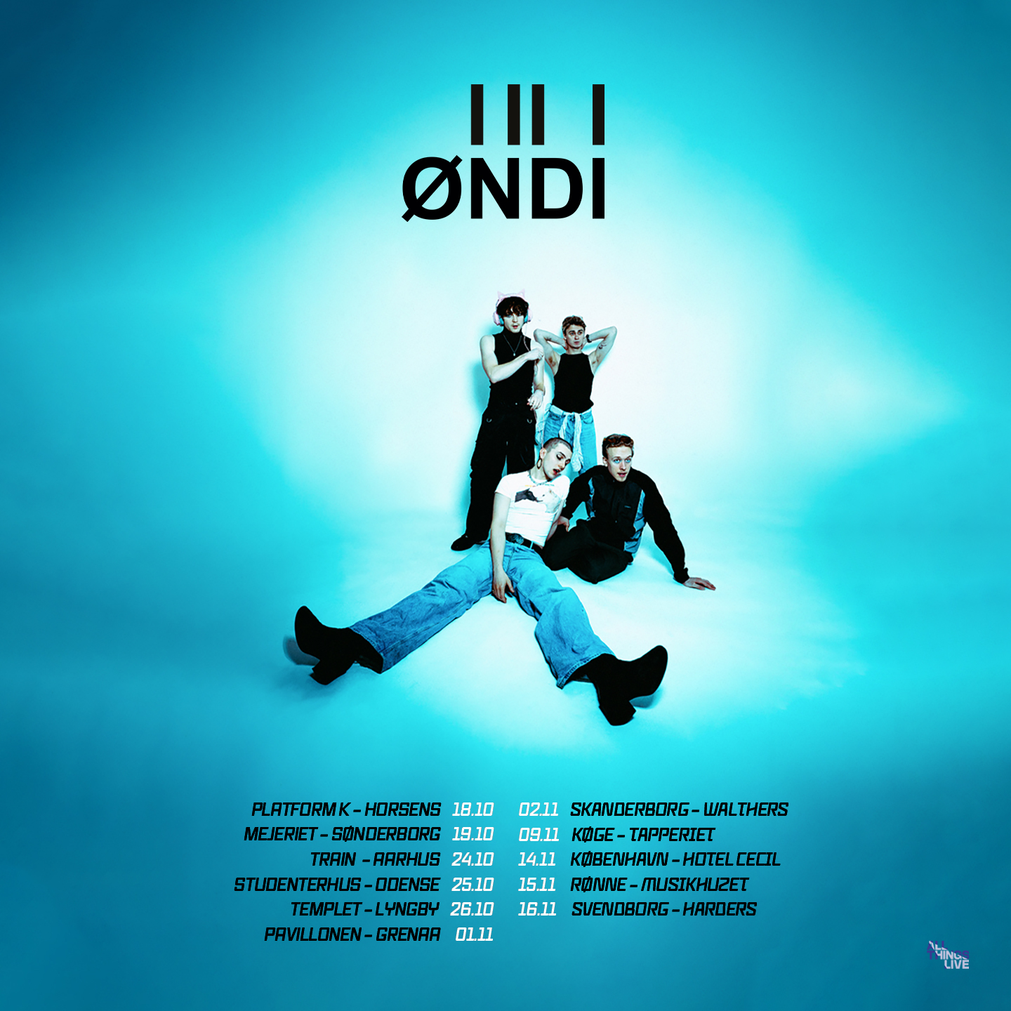 ØNDI skyder nu deres popstjerneenergi på vejene og indtager scener på tværs af landet og de er parate til at influere publikum med deres karakteristiske charme og efterlade et snert af tinnitus i ørerne og kærlighed i kroppen på dem, der oplever deres intense og eksplosive liveoptrædener.