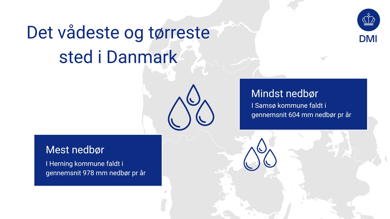 Vådeste kommune over 10 år (2006-2015) var Herning med 978 mm nedbør i gennemsnit, mens Samsø var den tørreste kommune med kun 604 mm nedbør i gennemsnit pr år.
