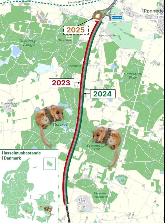 Onsdag den 1. maj besøgte transportminister Thomas Danielsen og præsidenten for Danmarks Naturfredningsforening Maria Reumert Gjerding Sydmotorvejen ved Rønnede, hvor Vejdirektoratet har lavet en sammenhængende passage, der skal gøre der muligt for hasselmusen at sprede sig. Det er til gavn for arten og øger dens mulighed for fortsat overlevelse. I Tyskland er der foretaget lignende tiltag, hvilket betyder, at bestanden af hasselmus nu er i fremgang langs vejene.