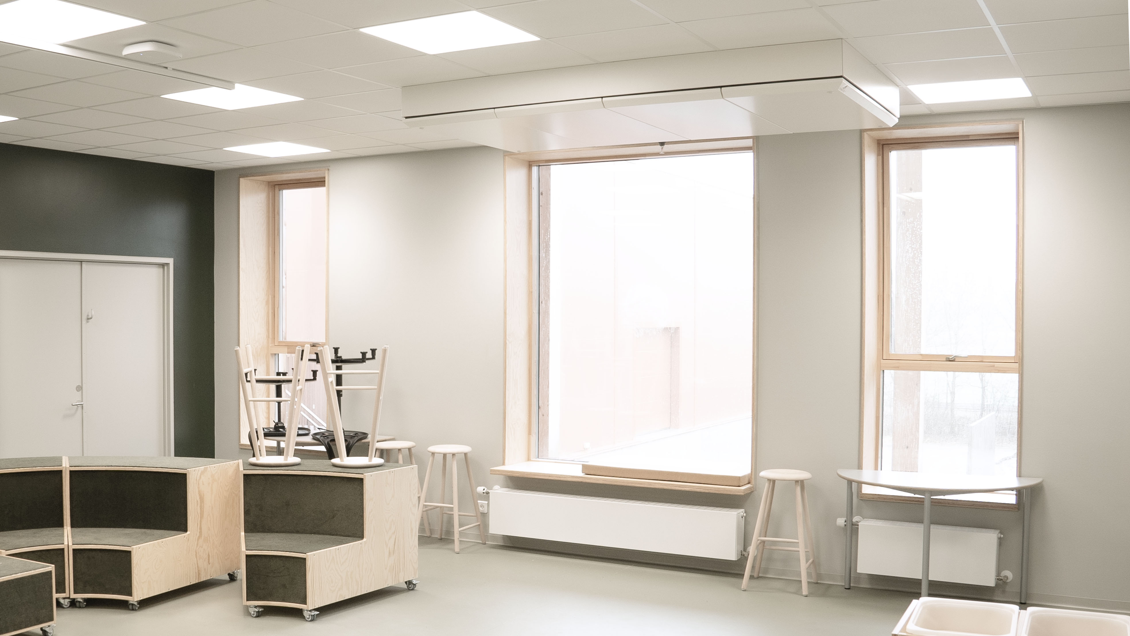 Større lokaler og gangarealer blev derimod koblet til et centralt ventilationsanlæg, da behovet for kontinuerlig manuel regulering her er mindre.