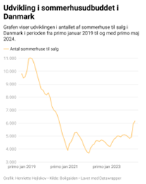 Der var i alt 6.177 sommerhuse til salg i starten af maj, som er 4,5 procent flere, end der var til salg i sidste måned. Det er første gang siden efteråret 2020, at der er over 6.000 sommerhuse i udbud på landsplan.