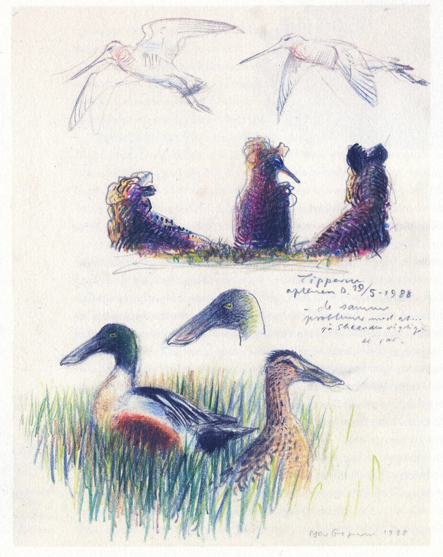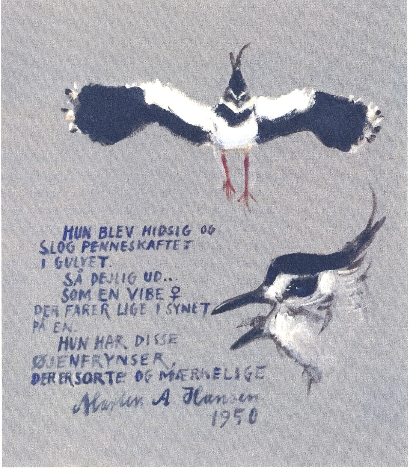 At det inkarnerede udendørsmenneske Jens Gregersens kunstneriske udtryk kan synes at blegne en smule, når han med sin tegneblok bevæger sig indendørs eller indbefatter arten menneske, rykker ikke ved denne lille bogs sarte og vibrerende skønhed, som en slags opsummering af et langt fugleliv. Han fanger fuglenes væsen bedst, når de ikke er på vingerne – flokken af rastende spover på en vade på bogomslagets indersider er suveræne og fandt i alternativ version med akryl på træplade vej til Johannes Larsen Museets særudstilling FUGL fra 2022. Her var Jens Gregersen, sammen med en række af vores fremmeste fuglekunstnere, naturligvis rigt repræsenteret.