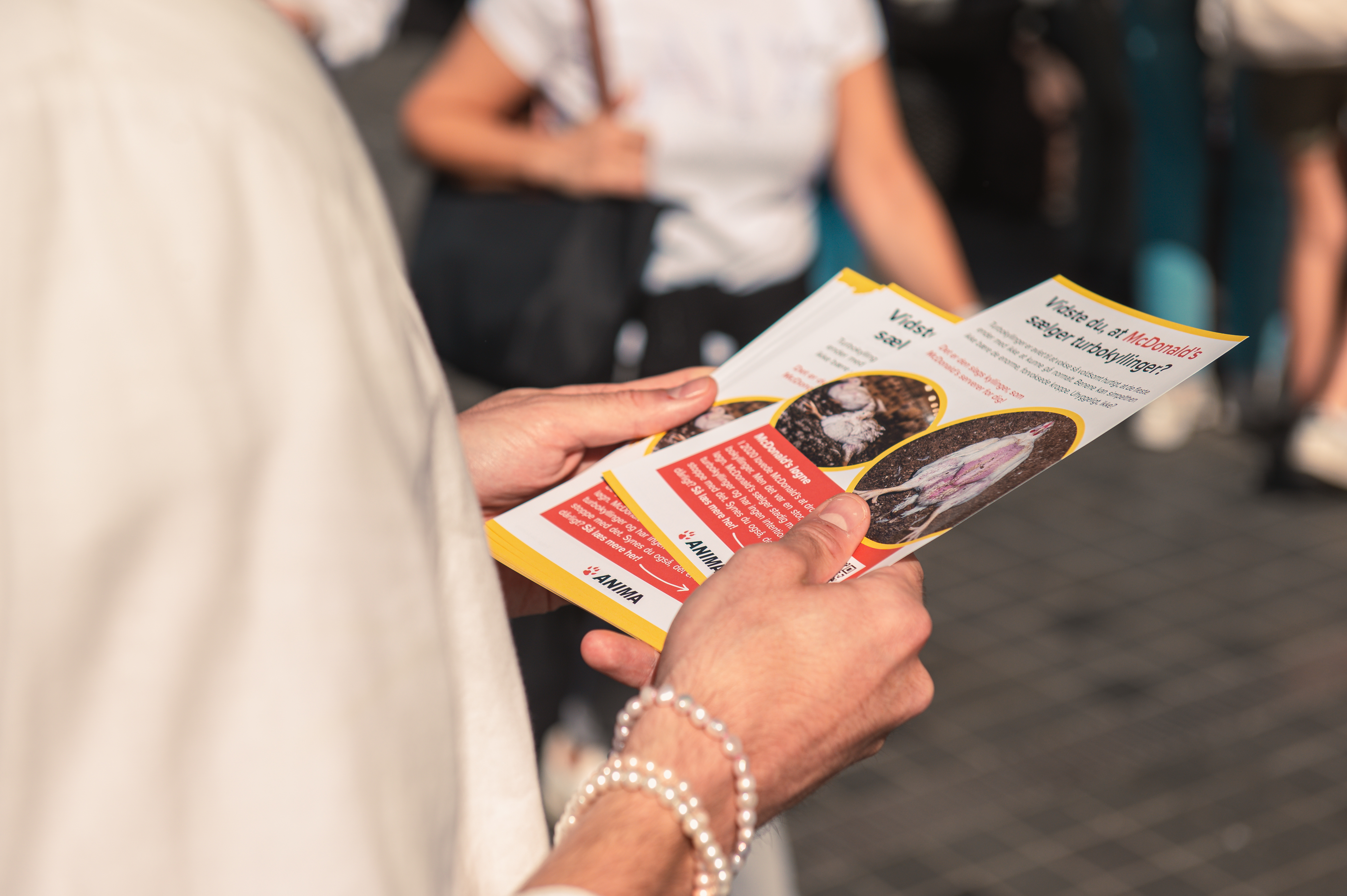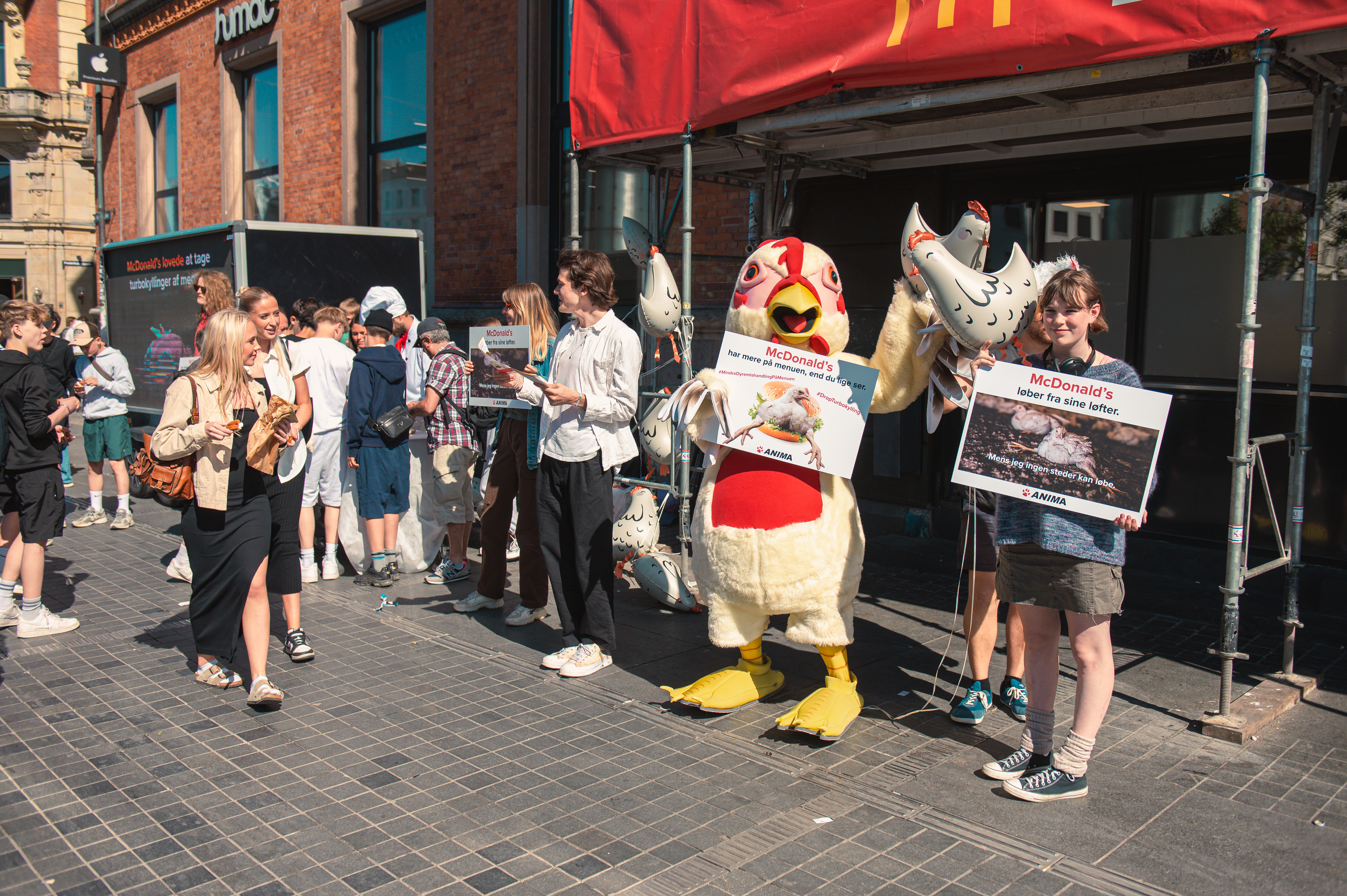 Med gratis nuggets til kædens kunder stod en stor flok dyrevenner torsdag foran McDonald’s på Nørreport i København for at give verdens nok mest kendte fastfoodfirma en dårlig smag i munden. I selskab med en kæmpe turbokylling serverede en aktivist i kokkekostume ikke kun snacks, men også sandheden om, at McDonald’s har fyldt os med løgn. Forbipasserende fik stukket en folder i hånden eller kunne på farten få budskabet indenbords via en oplyst storskærm.