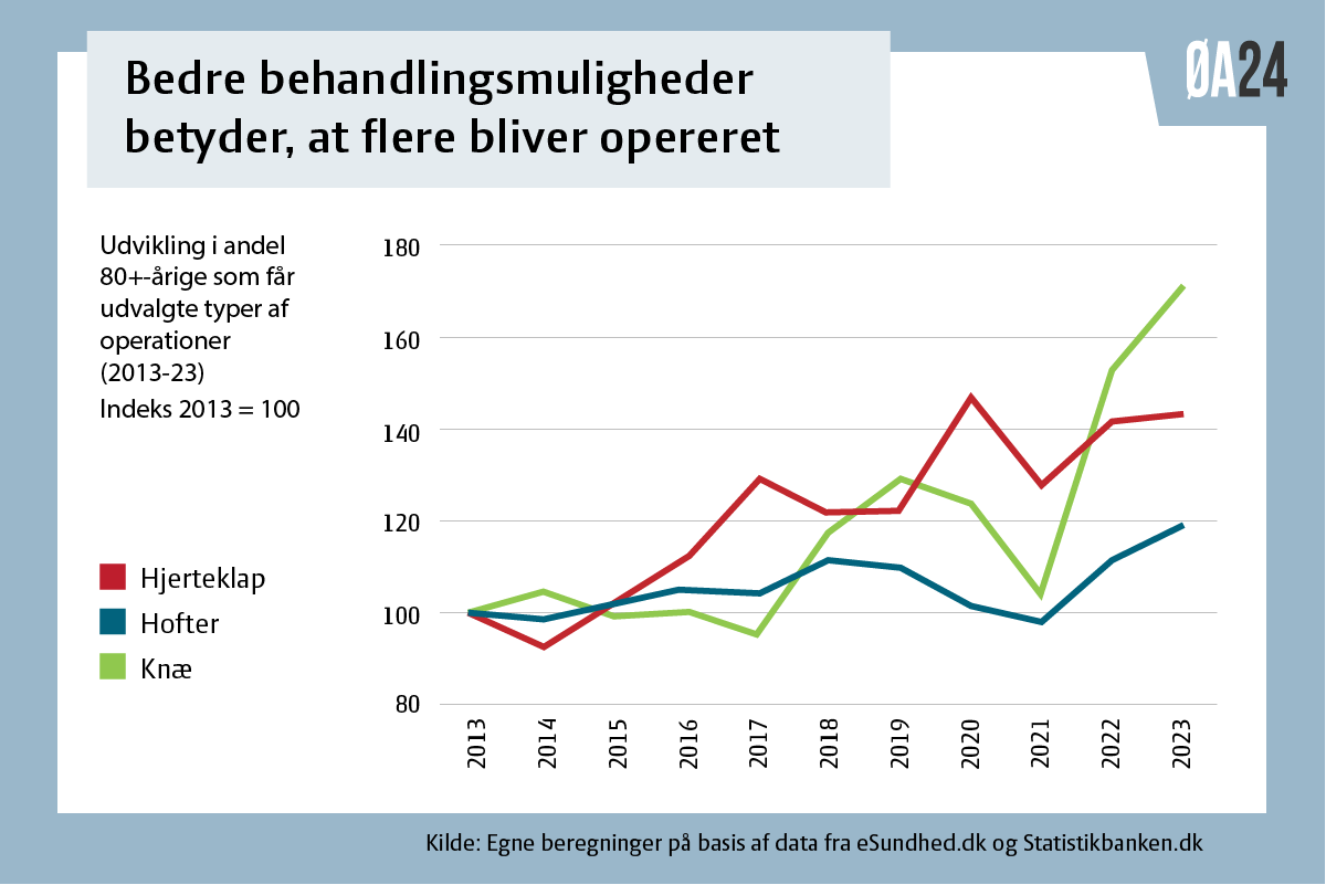 Et konkret eksempel er antallet af ældre danskere over 80 år, som får foretaget eksempelvis hofte- knæ- eller hjerteklapoperationer. Mellem 2013 og 2023 steg andelen, der fik indsat et kunstigt knæ med 71 pct., andelen der fik indsat en kunstig hofte med 19 pct. og andelen der fik en hjerteklapoperation med 42 pct. Det er langt over hvad befolkningsudviklingen tilsiger.