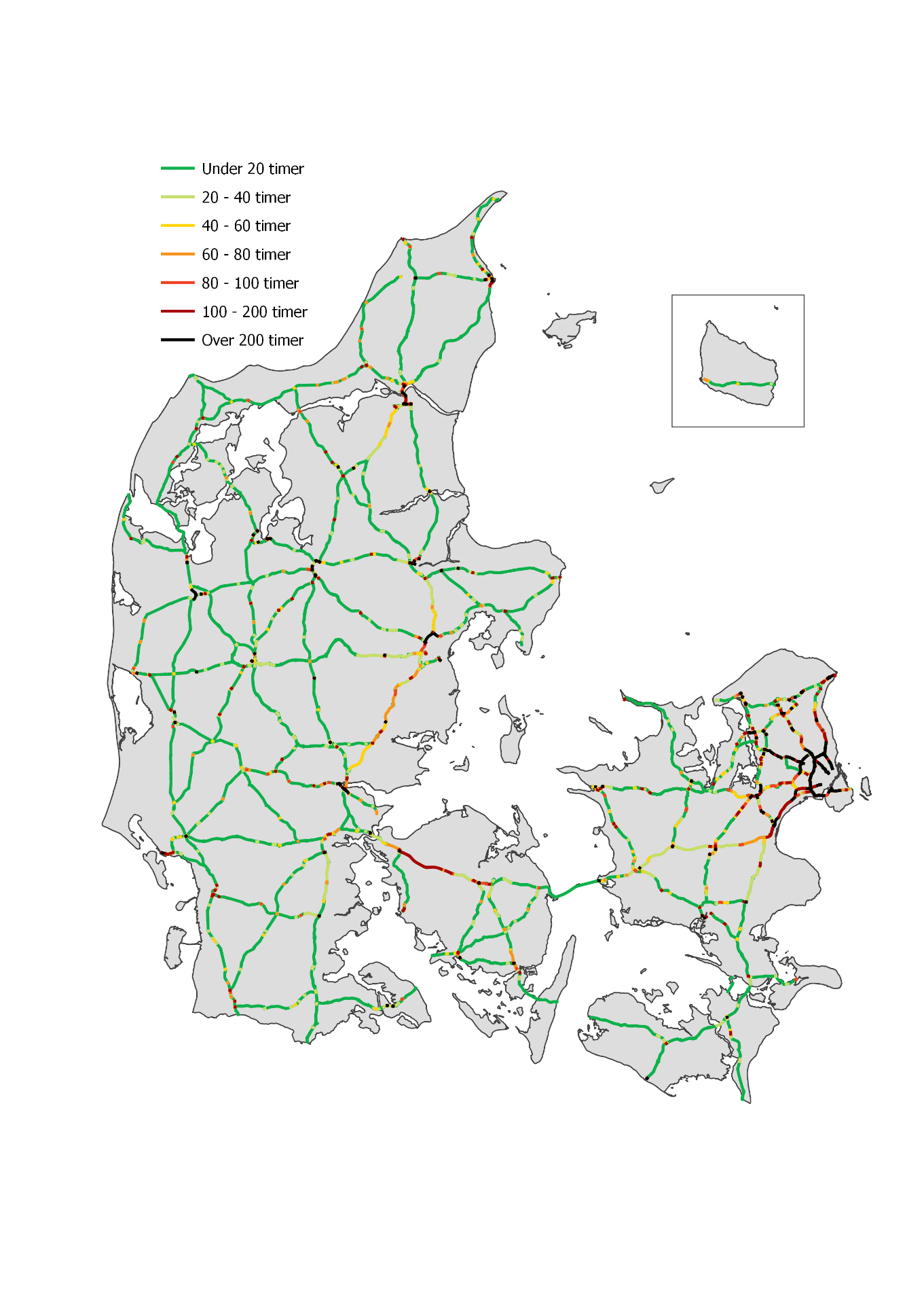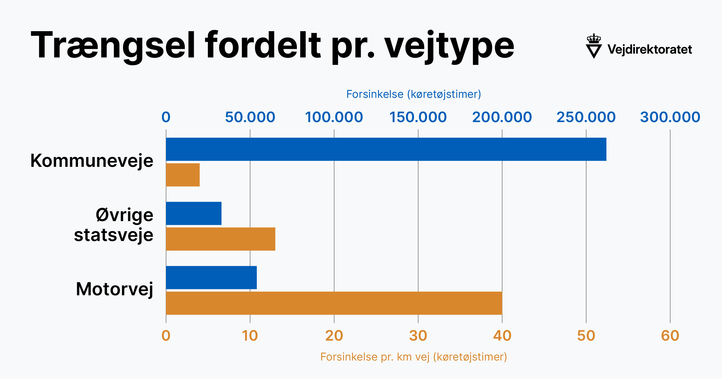 Tallene dækker både over statsvejene og de kommunale veje, hvoraf sidstnævnte udgør 95 pct. af det samlede vejnet. Det er dog på motorvejene, at der bliver brugt flest timer på at sidde i kø, når man sammenholder med vejens længde.