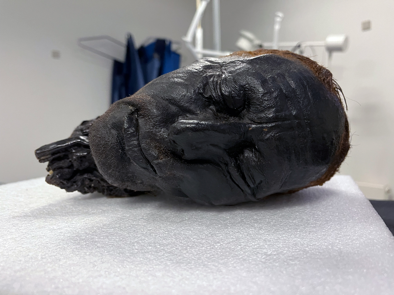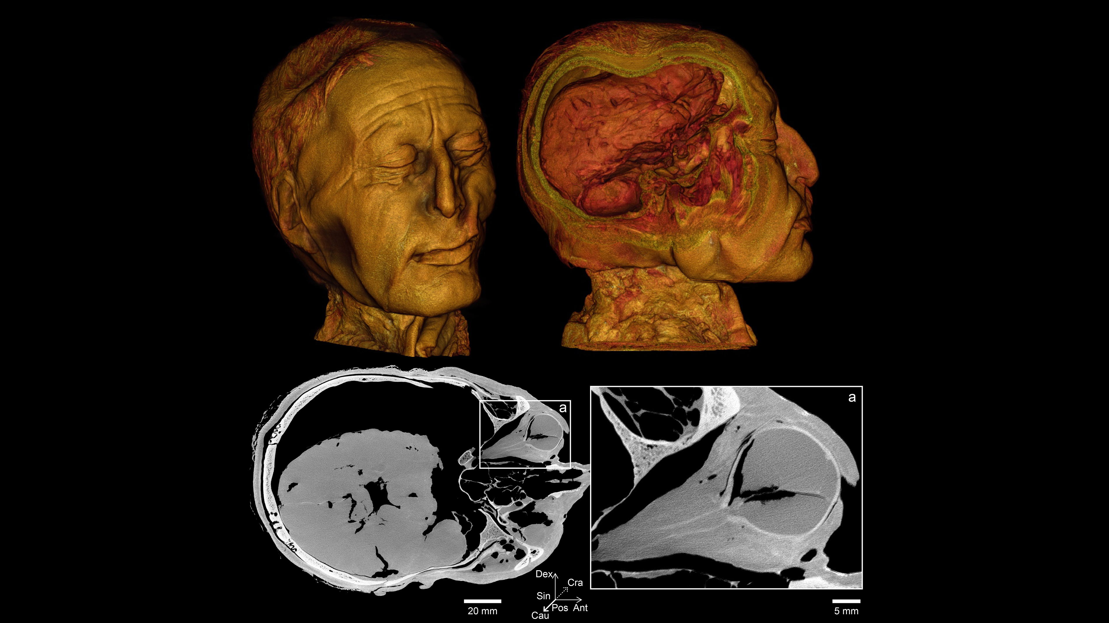 ”Det er helt exceptionelt, at han har øjne og mund, der ikke er ødelagt. Læber er noget af det første, der bliver ødelagt, når et lig går i forrådnelse, men han ligger der med et nærmest Mona Lisa-agtigt smil. Vi kunne ikke drømme om at tvinge munden op for at se tænderne, men nu kan vi se dem på scanningen,” siger han.