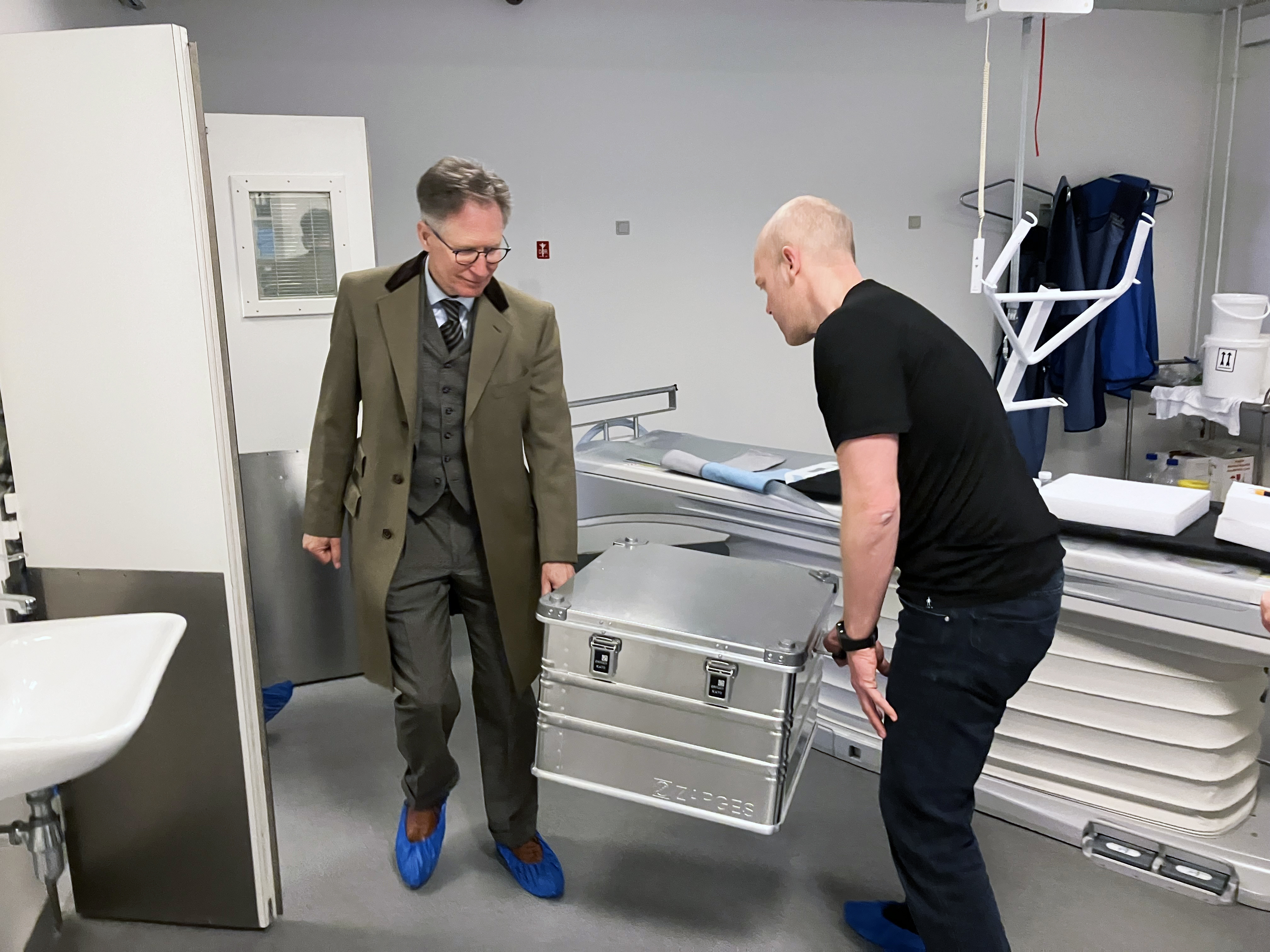 På Institut for Retsmedicin stod radiograf Christina Carøe Ejlskov Pedersen og adjunkt Kasper Hansen klar sammen med lektor Henrik Lauridsen fra Institut for Klinisk Medicin til at scanne Tollundmandens hoved med den spritnye mikro-CT-scanner.