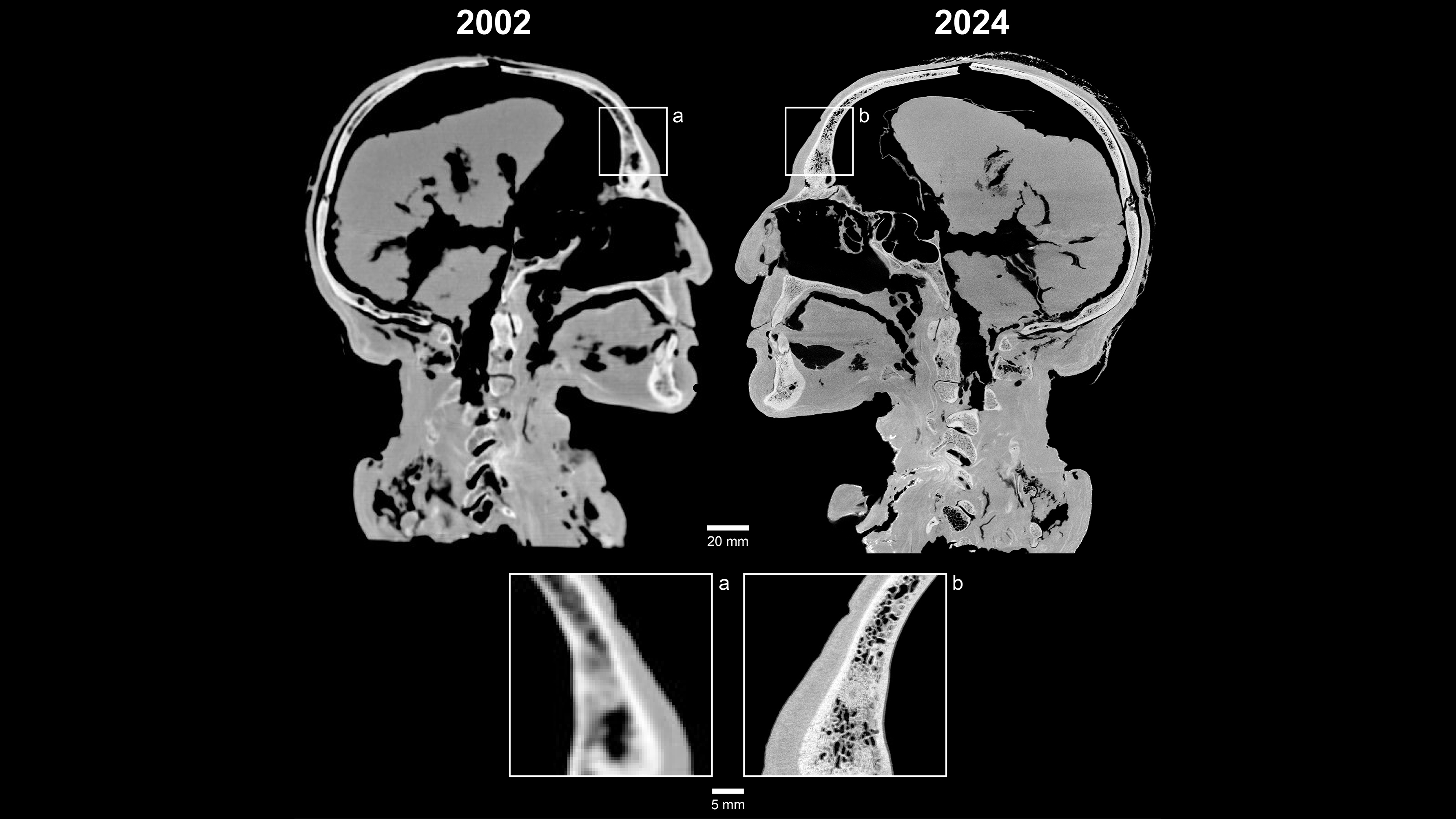 Hovedet har været scannet én gang før – i 2002. På de gamle scanninger kunne man kun se tænderne som utydelige pløkker. Sammenligner man de nye scanninger med de gamle, er det fuldstændig som at have fået nye briller, siger Ole Nielsen. Opløsningen i de nye billeder er 422 gange bedre end i de gamle. Det gør en forskel.