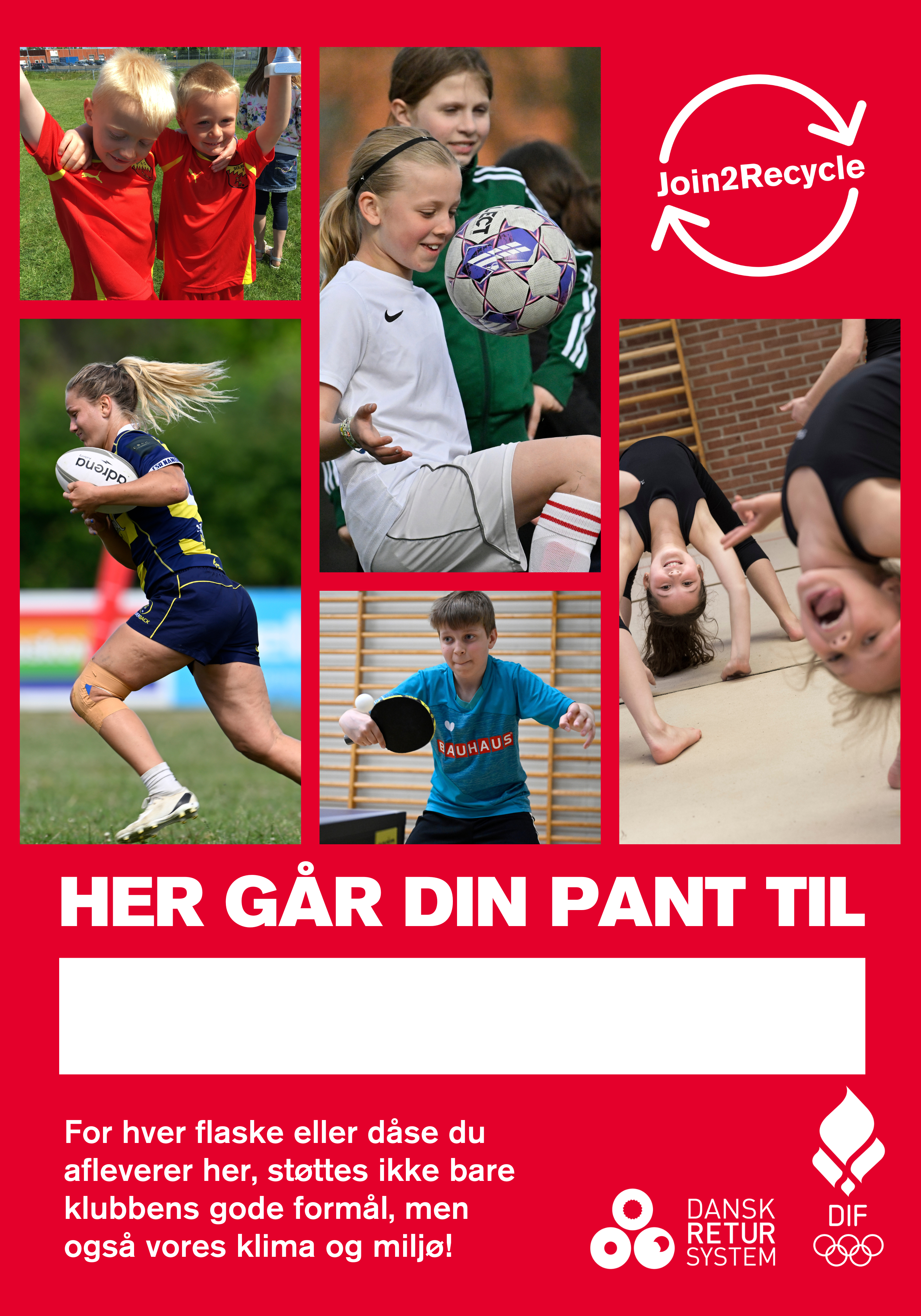 Danske idrætsforeninger har nu muligheden for - via et nyt samarbejde mellem DIF og Dansk Retursystem - at tilmelde sig pantkonceptet Join2Recycle. Et plug and play-koncept, som hjælper med at få sorteret flasker og dåser fra andet affald, så de kan pantes og genanvendes.