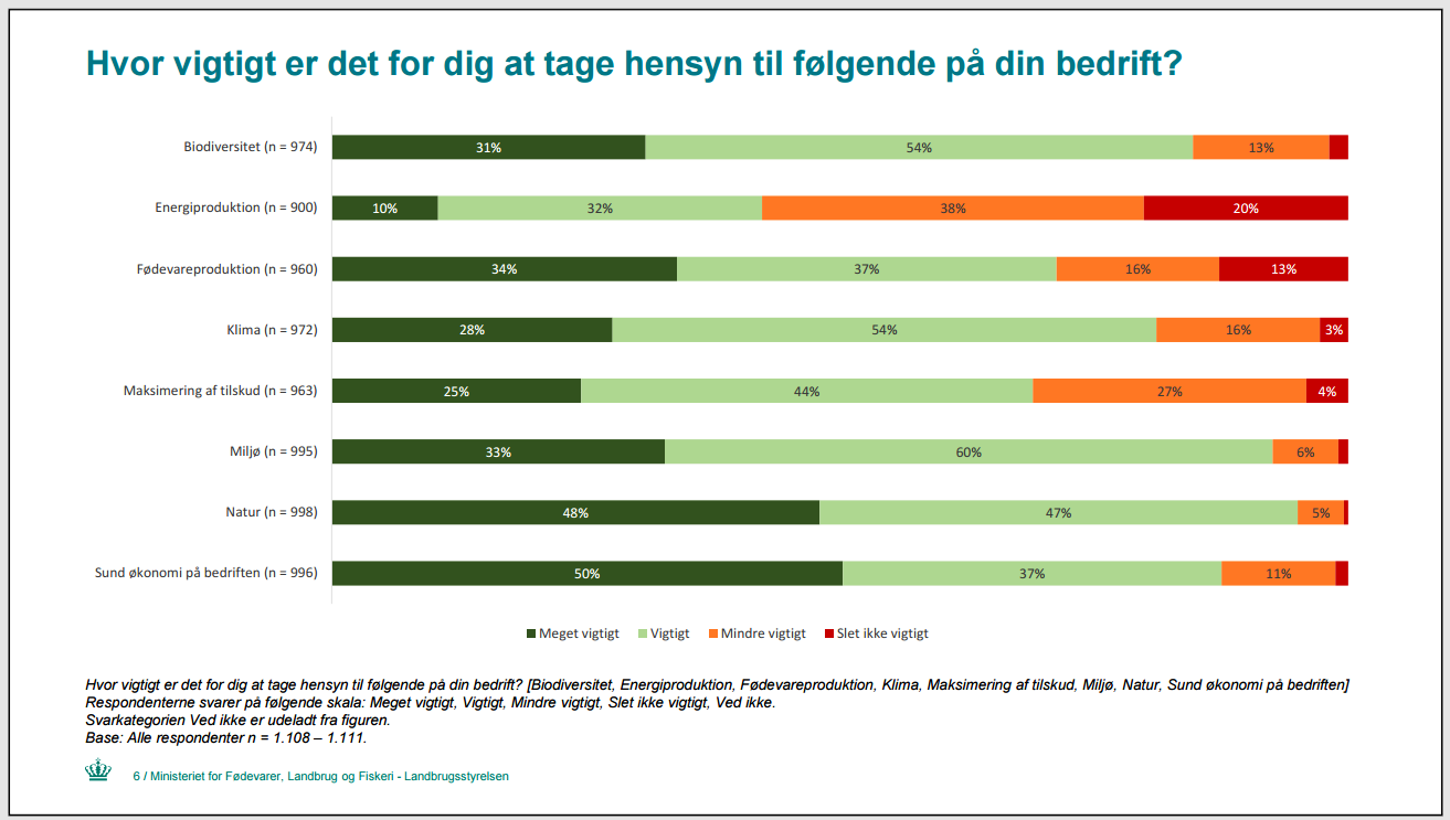 For langt de fleste agroproducenter er miljø, natur, biodiversitet og klima vigtigtigere at tage hensyn til end stort set alt andet på deres fabrik. Faktisk placerer et overvældende flertal natur (95 pct.), miljø (93 pct.), biodiversitet (85 pct.) og klima (81 pct.) højere eller på højde med bedriftens sunde økonomi (87 pct.). Faktisk mener hele 13 pct., at det er mindre eller slet ikke vigtigt med en sund økonomi.