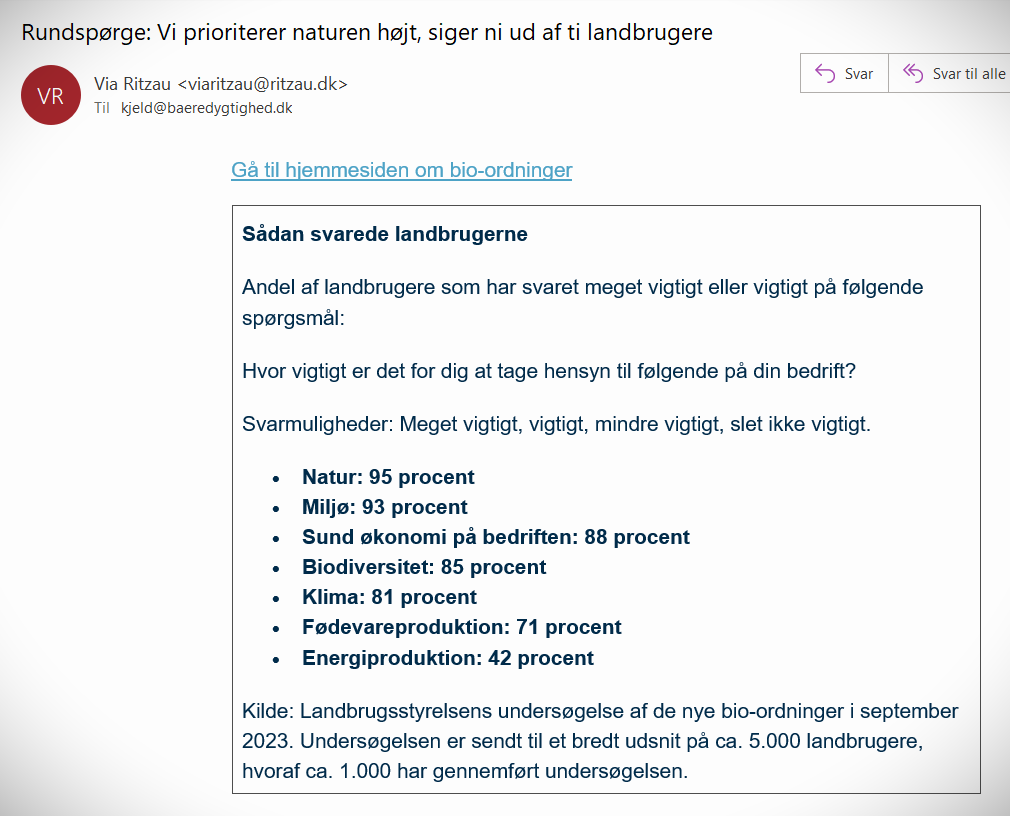 Disse procenter fremgår af en undersøgelse, som Landbrugsstyrelsen offentliggjorde 27. november 2023. Undersøgelsen havde karakter af en rundspørge, som personale hos Landbrugsstyrelsen selv havde foretaget.