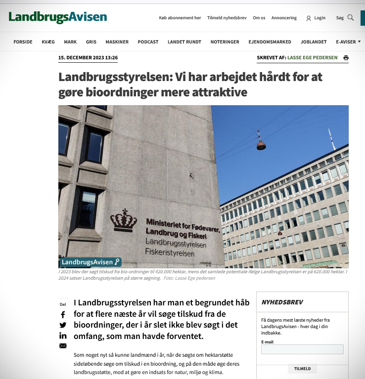 ”Resultaterne i undersøgelsen giver et værdifuldt pejlemærke til os om landbrugernes interesse i at deltage i den grønne omstilling. Det er afgørende, at landbrugere deltager med en aktiv indsats, hvis vi skal komme i mål. Her spiller Landbrugsstyrelsens bio-ordninger en central rolle, og vi håber derfor på en øget søgning til ordningerne i 2024.”