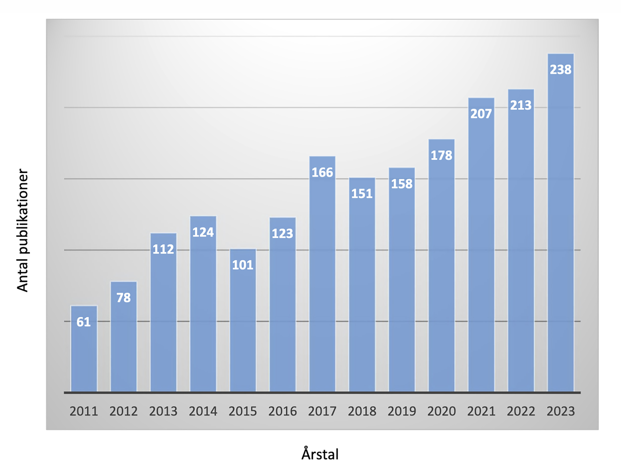 Den stigende forskningsaktivitet kan også ses af at antallet af peer-rewiewed publikationer, der er steget støt gennem årene til rekordhøje 238 i 2023.