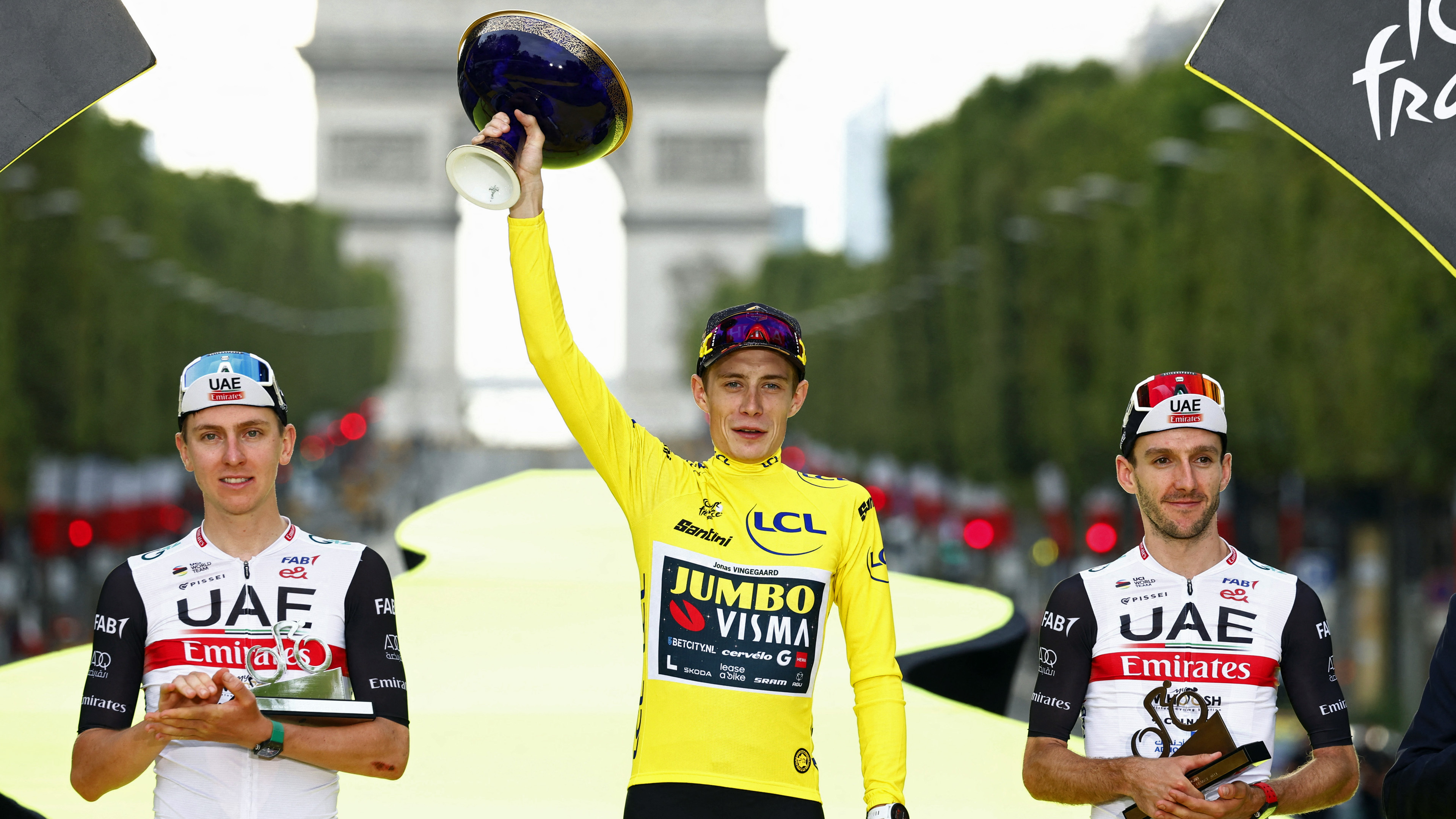Tadej Pogacar, Jonas Vingegaard og Adam Yates på Tour-sejrsskamlen i Paris 2023. (Foto: Garnier Etienne/Reuters/Ritzau Scanpix/TV 2)