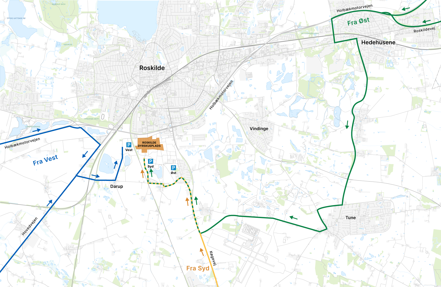 Hvis du for eksempel ankommer fra København via Holbækmotorvejen og har kurs mod parkering Syd, så skal du køre af ved frakørsel 8 Fløng og følge de gule skilte med teksten “Roskilde Dyrskue P”, indtil du møder skilte med påskriften ”Roskilde Dyrskue P Syd”. Hvis du oplever kø ved frakørsel 12 Roskilde S, kan du med fordel køre videre til frakørsel 14 Roskilde V.