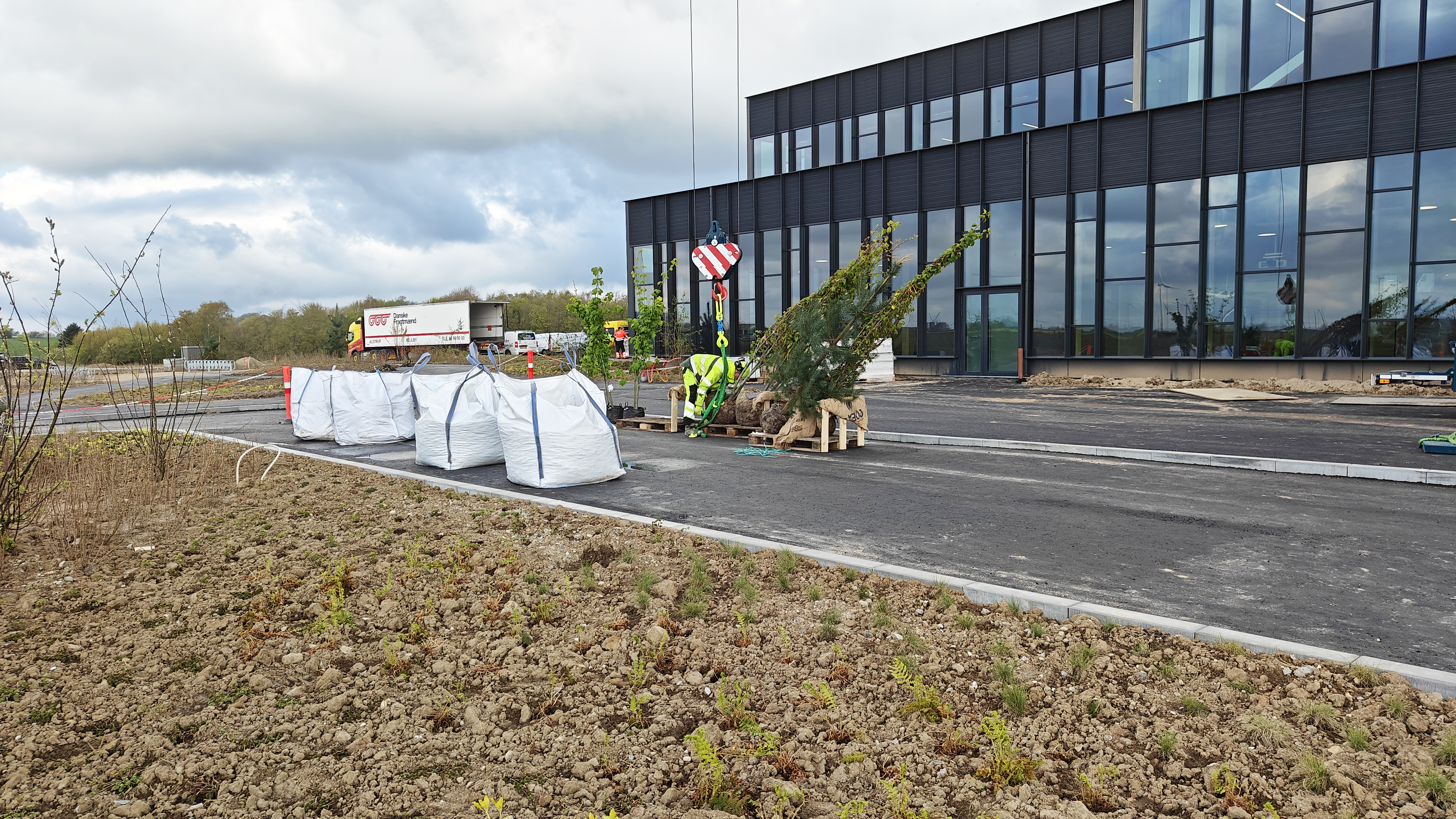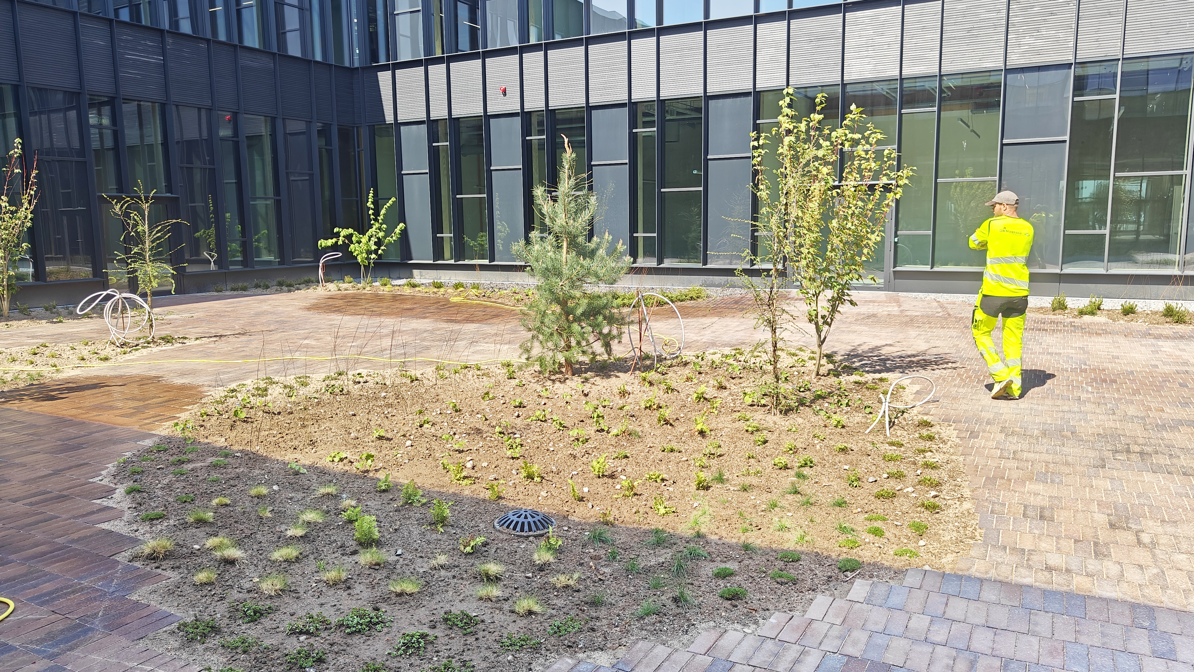 I projektet har der netop været fokus på de grønne omgivelser, der er tegnet af Henrik Jørgensen Landskab, og OKNygaard nærmer sig afslutningen af deres etableringsarbejde. OKNygaard anlægger 4.000 m2 p-plads i græsarmering, sætter kantsten, etablerer stier, anlægger atriumgården, planter træer og stauder og sår enggræs. Netop i disse uger er der ekstra meget travlhed på pladsen – der er 15-20 OKNygaard-medarbejdere i arbejde for at blive færdige. Bygningerne er så småt taget i brug, mens OKNygaard skal aflevere den første og største del af projektet midt i juni. Det afsluttende plantearbejde sker i efteråret.