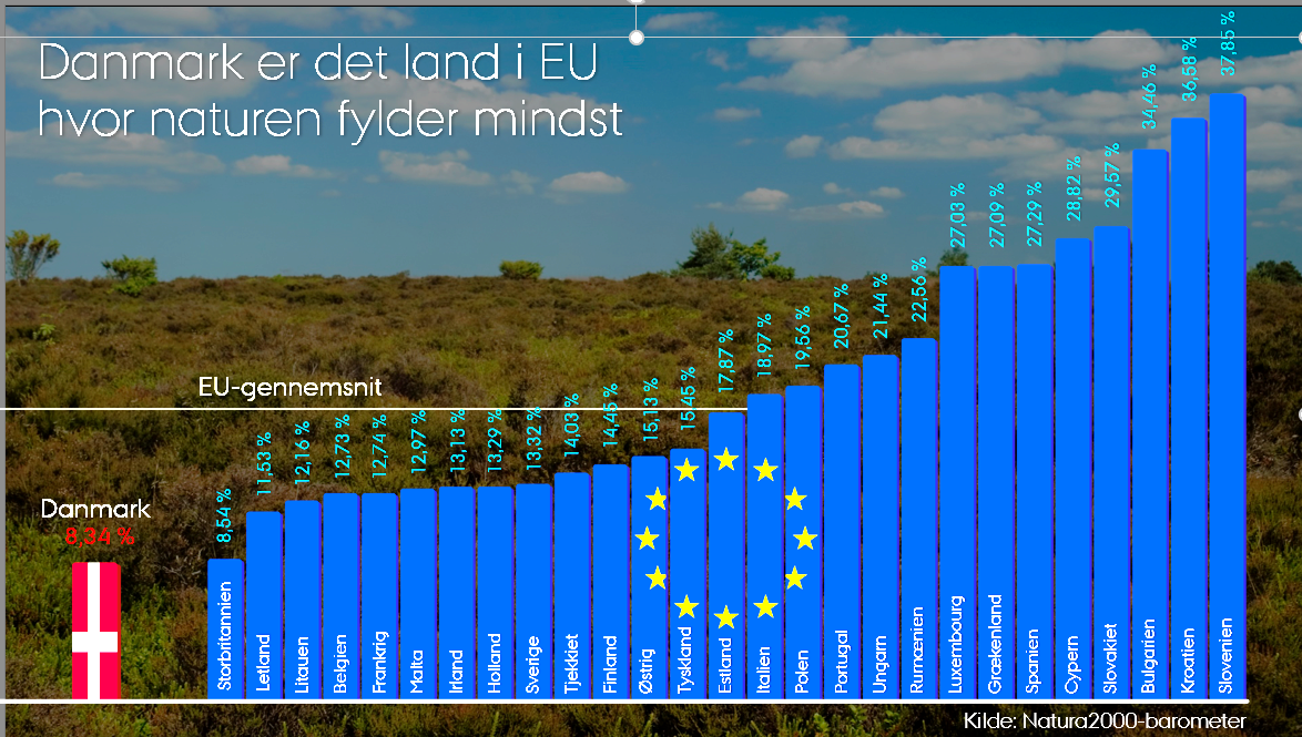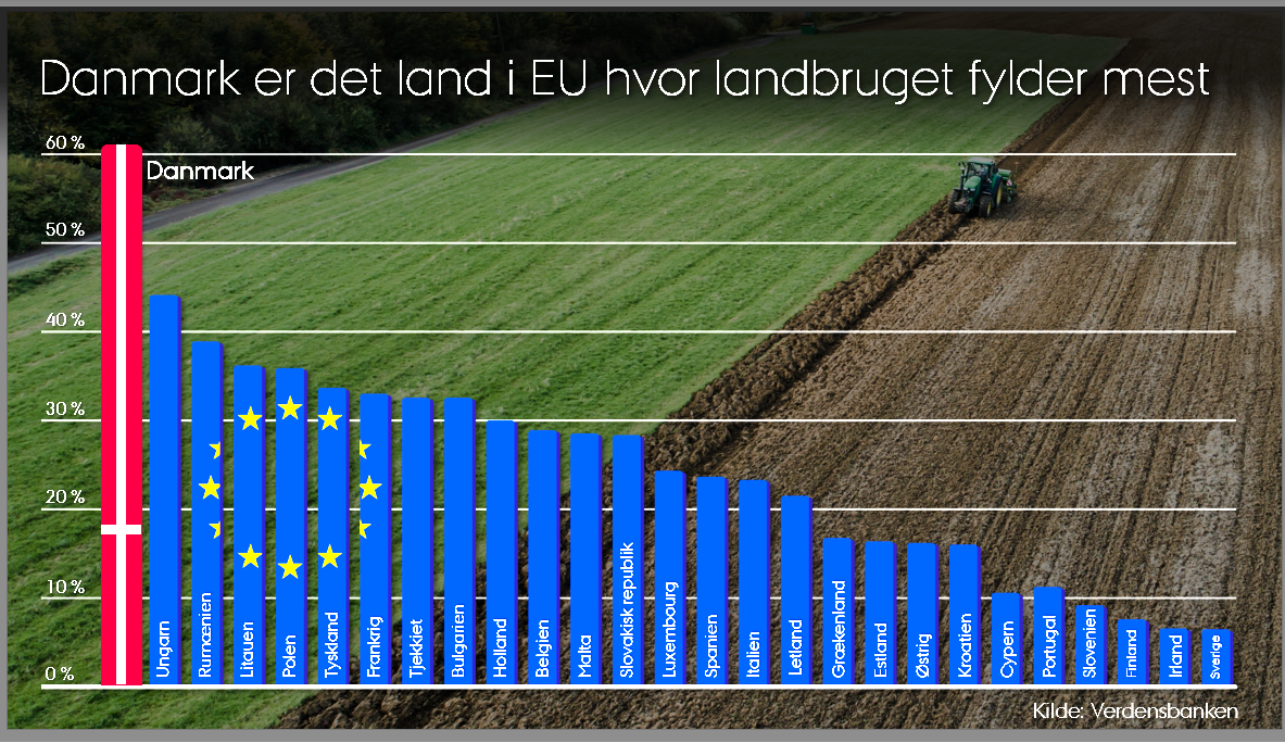 Men ser man udelukkende på, hvor meget landbruget fylder i landskabet, så har statsminister Mette Frederiksen jo ret, og det i ganske overvældende høj grad. Med 61 procent af landet under plov er vi det hårdest dyrkede land i EU og sandsynligvis i hele verden. Det betyder også, at med blot 8,34 procent naturareal er vi det naturfattigste land i EU og blandt de naturfattigste på verdensplan.