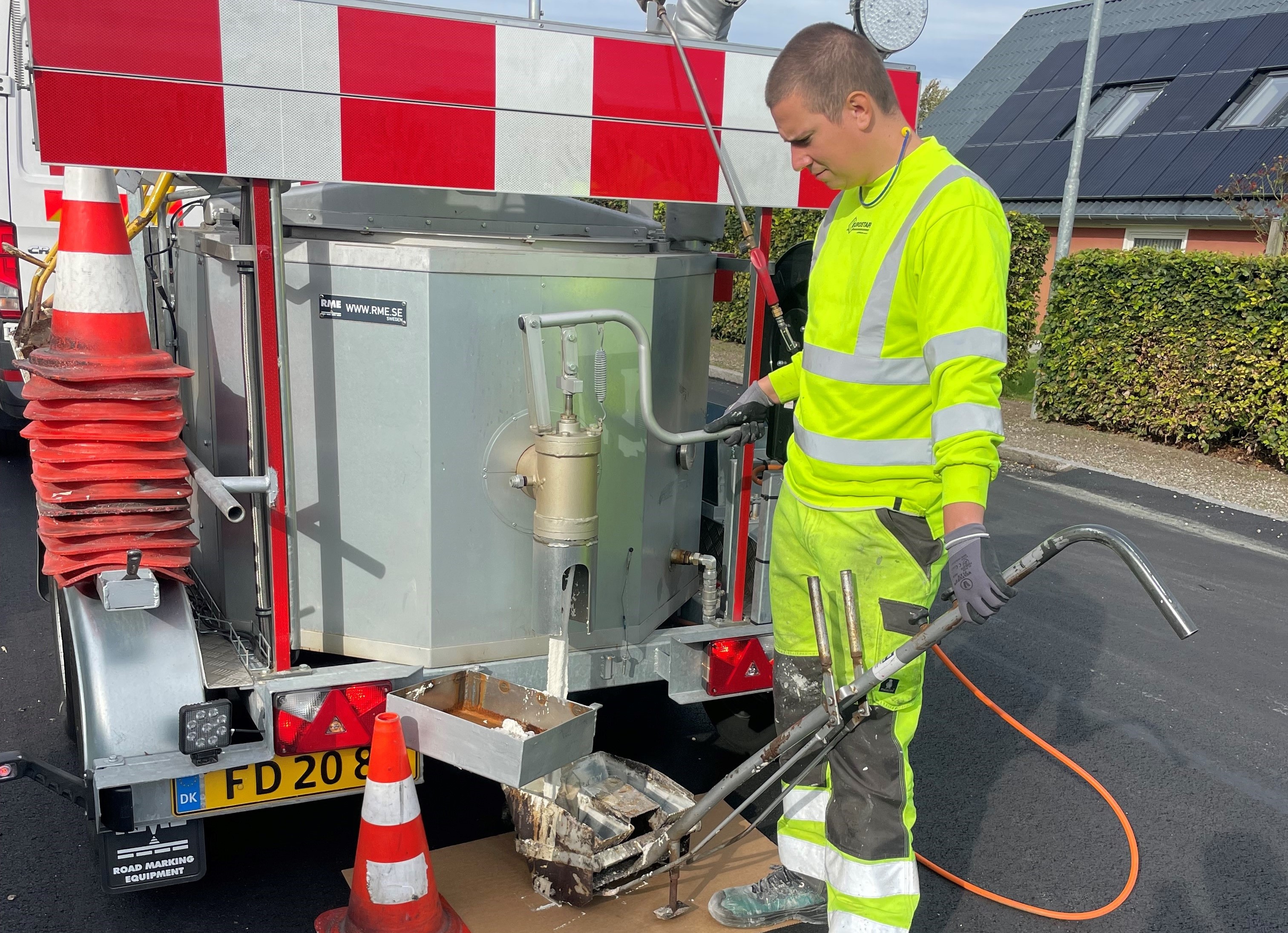 At lægge vejstriber ud er en energikrævende opgave. Det granulat, der bruges, skal varmes op til 180 grader, før det i flydende form kan lægges og fæstnes på asfalten. Det betyder samtidig, at materialet konstant skal holdes på 180 grader, så længe der arbejdes.