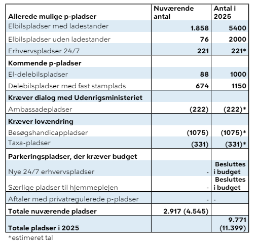 I udgangspunktet vil der frem til og med 2025 blive oprettet 5.400 elbilspladser med lademulighed, 2.000 pladser til elbiler, hvor der ikke kan lades, mere end 2.000 delebilspladser og ca. 220 erhvervspladser.