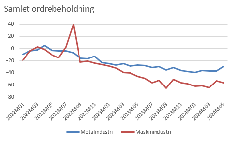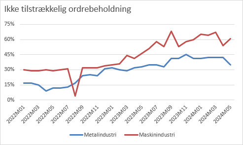 I maj måned oplevede 35 procent af virksomhederne i metalindustrien at have for få ordrer i bogen, mens det var tilfældet for hele 61 procent i maskinindustrien.