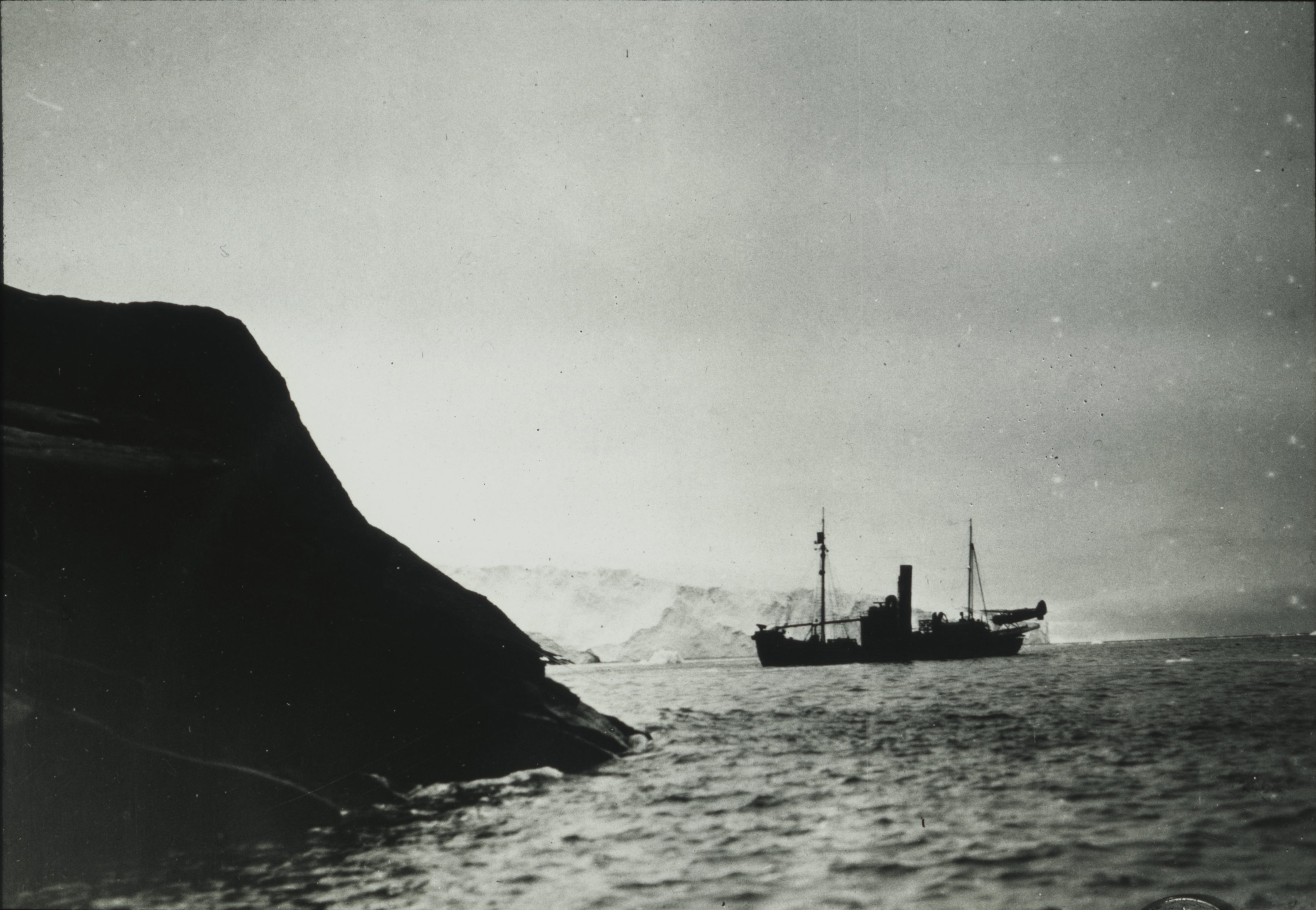 Hvalfangerskibet Firern, med Stinson Reliant flyet ombord, nær Klarius Mikkelsen Fjell i Lars Christensen Land i Østantarktis. Copyright Norske Polar Institut