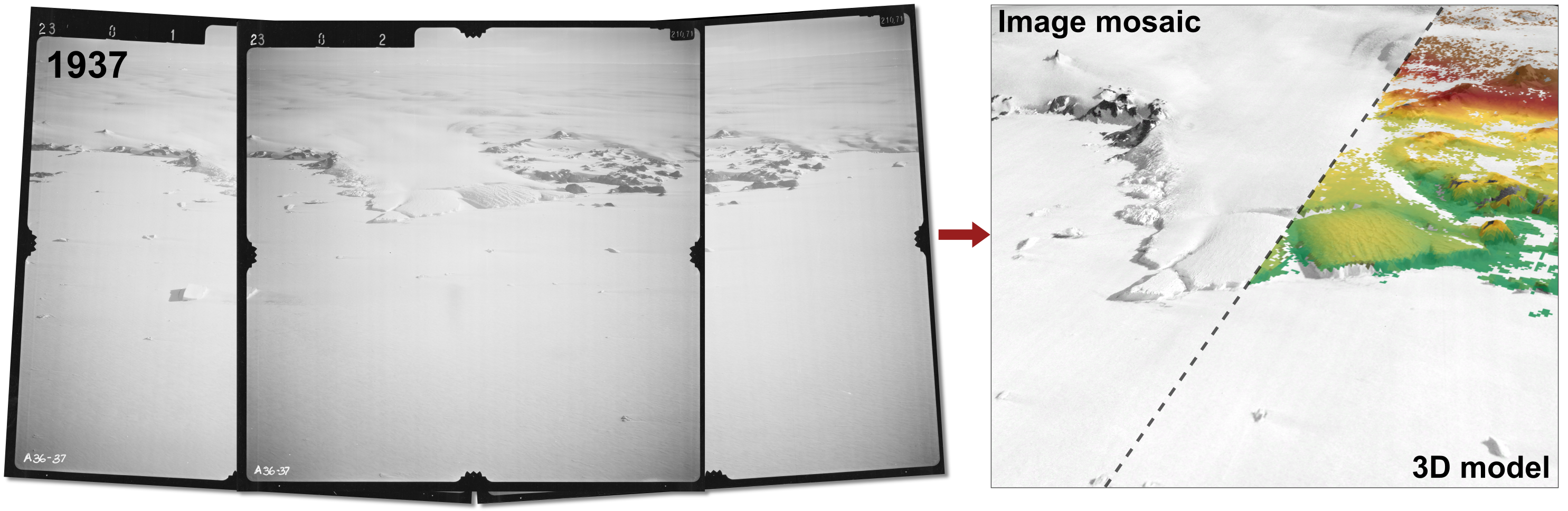 Fra flybilleder til 3D-modeller. Flybilleder af Taylor gletsjeren i Østantarktis fra 1937 kan med moderne billedprocesseringsteknikker omdannes til 3D modeller og sammensatte billedmosaikker. Dette giver forskerne en unik mulighed for at studere ændringer i gletsjeren næsten 100 år tilbage.