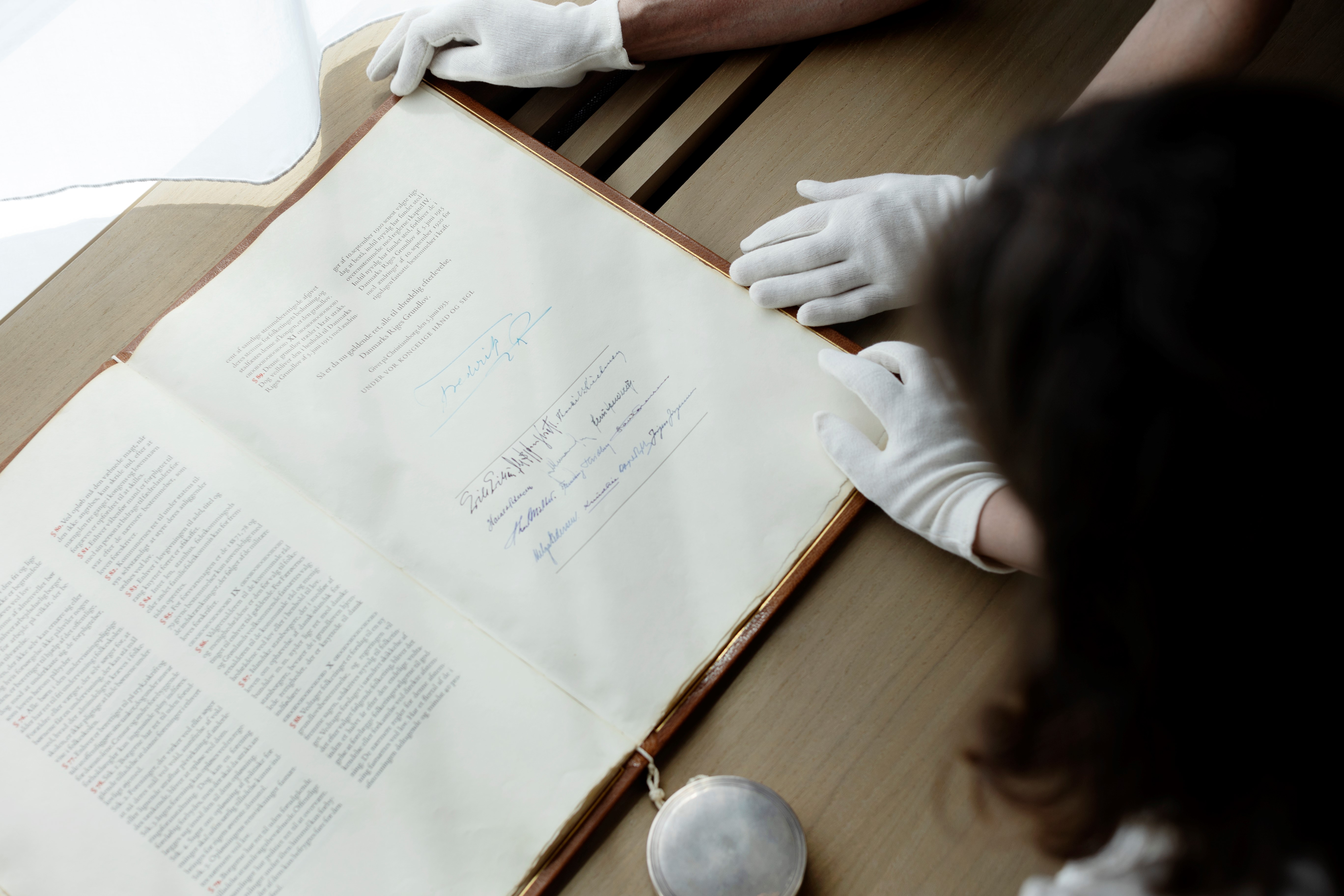 - På nogle af siderne kan man ane en let brun misfarvning langs papirets kant i grundloven fra 1953. Det kan skyldes træfibre i papiret produktion, som indeholder en syre, der farver med tiden.