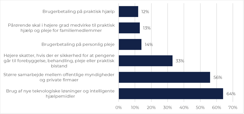 Det viser en befolkningsundersøgelse blandt 1.000 danskere foretaget af Analyse Danmark for Ingeniørforeningen, IDA. Hele 64 procent af de adspurgte peger på øget brug af teknologi som en del af løsningen, hvilket gør det til den absolutte højdespringer i undersøgelsen. I bunden ligger øget brugerbetaling på praktisk hjælp og personlig pleje.