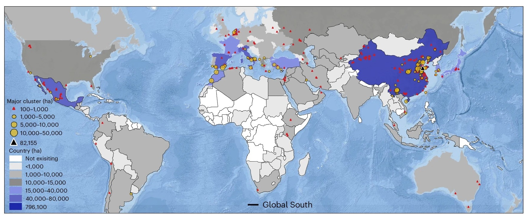 - Large and small greenhouse clusters distributed across 119 countries were included in the study. The two largest clusters are in Weifang, China and Almería, Spain. Overall, greenhouses cover 2.7 more land in the Global South than in the Global North.