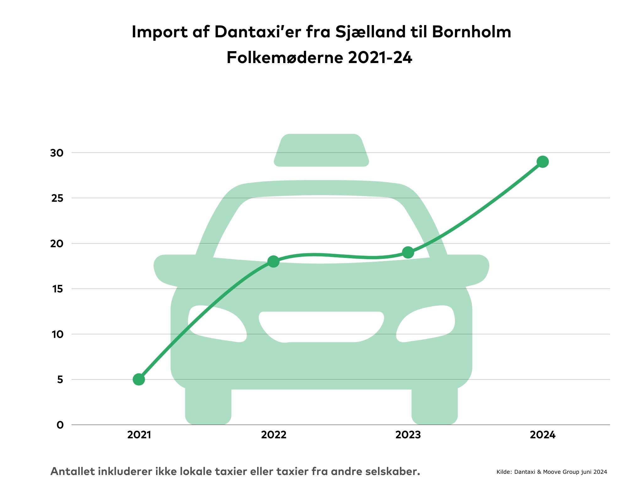 Tallet er ikke endeligt opgjort, men antallet af taxier til årets Folkemøde på Bornholm kan blive så højt som 60, og det er en ny rekord. Set i forhold til de 13 taxier, der betjener øen til dagligt, er der tale om mere end en fire-dobling. De mange ekstra taxier er et resultat af en liberal taxilovgivning, vurderer Danmarks største taxiselskab, Dantaxi.