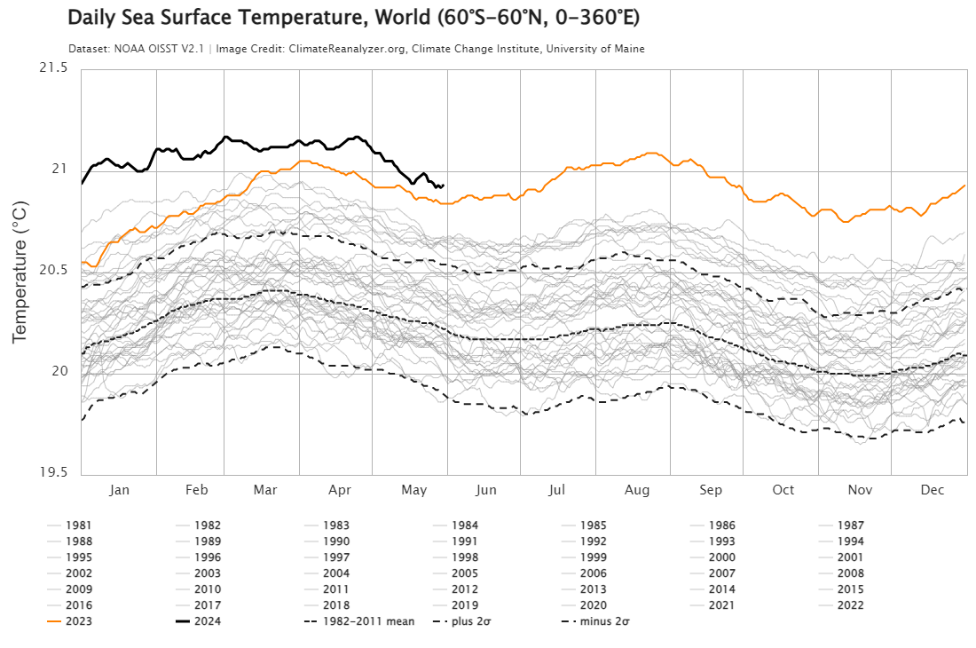 Målinger af den globale havoverflade fra NOAA, USA’s nationale havtjeneste, viser, at havtemperaturen også har ligget på et rekordhøjt niveau i over et år siden marts 2023. Maj 2024 slår dermed den kun et år gamle maj-rekord for havoverfladetemperaturen fra 2023.