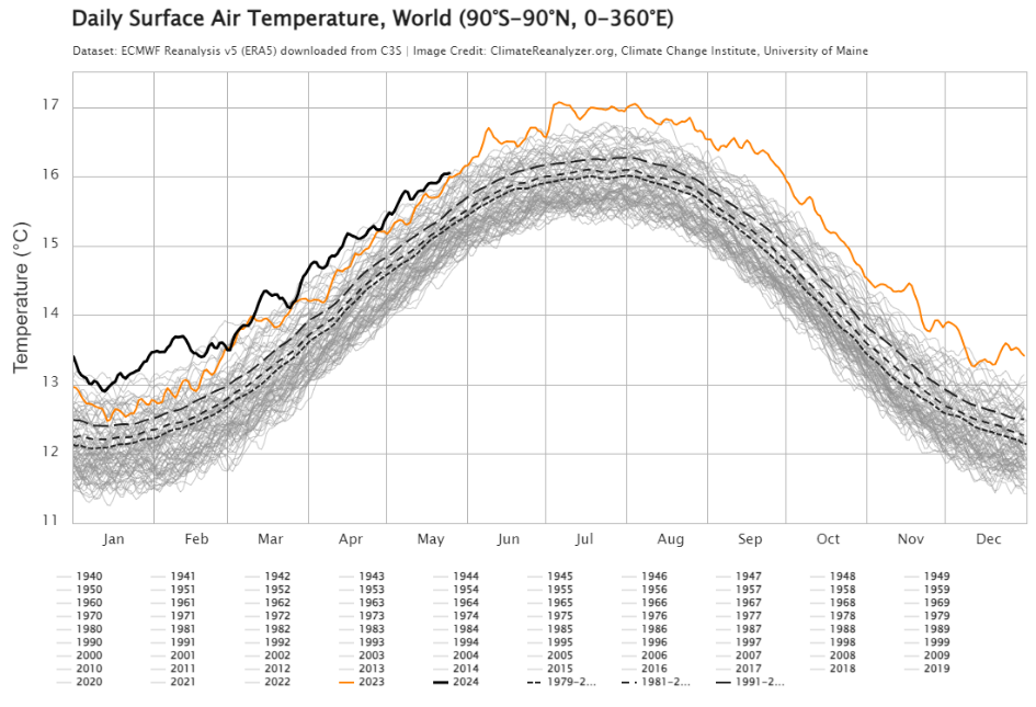 Ifølge EU’s klimatjeneste Copernicus har hver måned siden juni 2023 sat ny varmerekord for den pågældende kalendermåned, og nu kan maj 2024 også kåres som den varmeste maj nogensinde målt, når foreløbige data fra satellitmålinger og målestationer verden rundt er analyseret og lagt sammen. Dermed har hver måned i ét år sat global varmerekord.