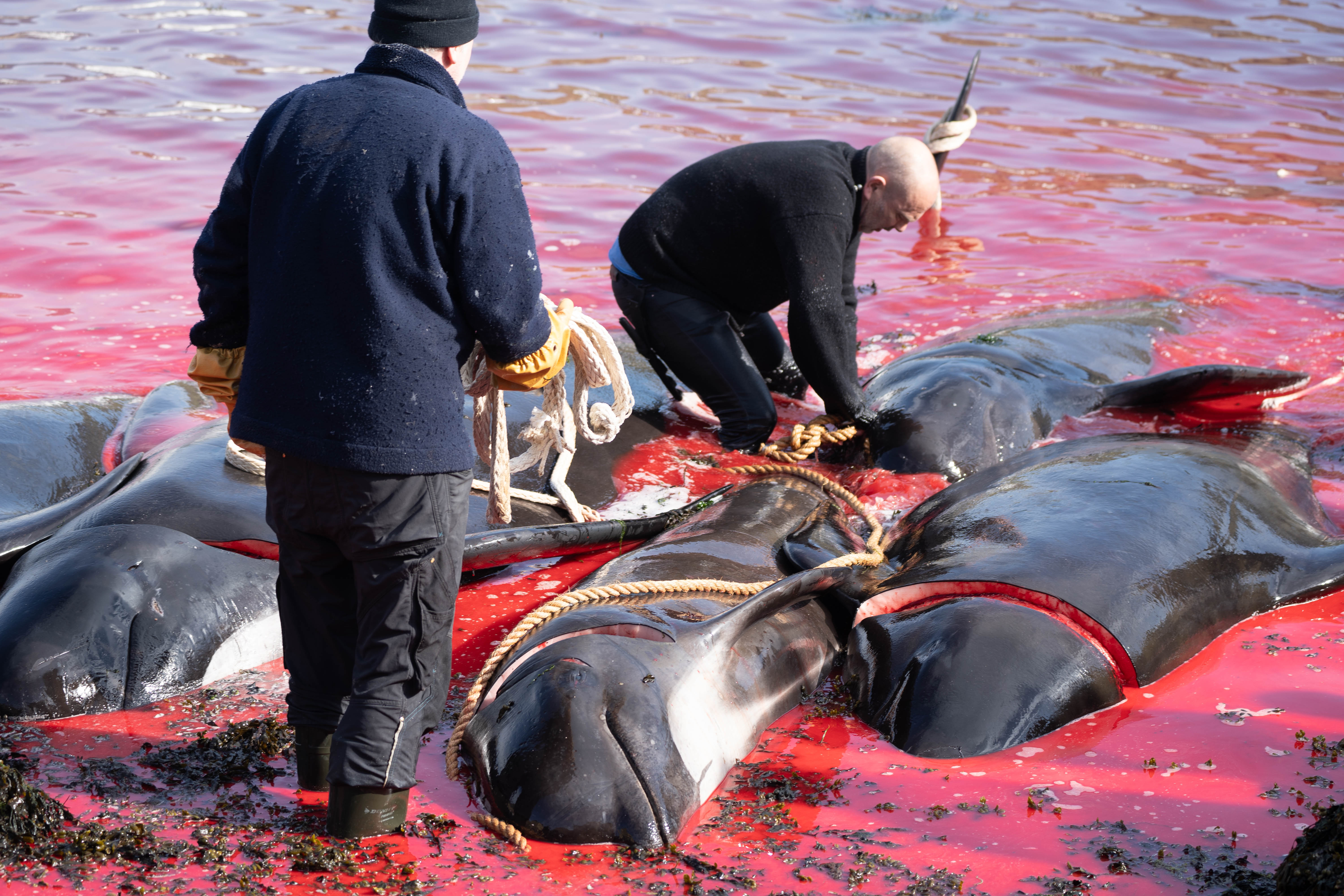 Mere end 130 hvaler blødte ihjel i den færøske bugt, Hvannasund på Færøerne efter, at have fået skåret rygraden over med hvaljægernes særlige ‘lansekniv’.