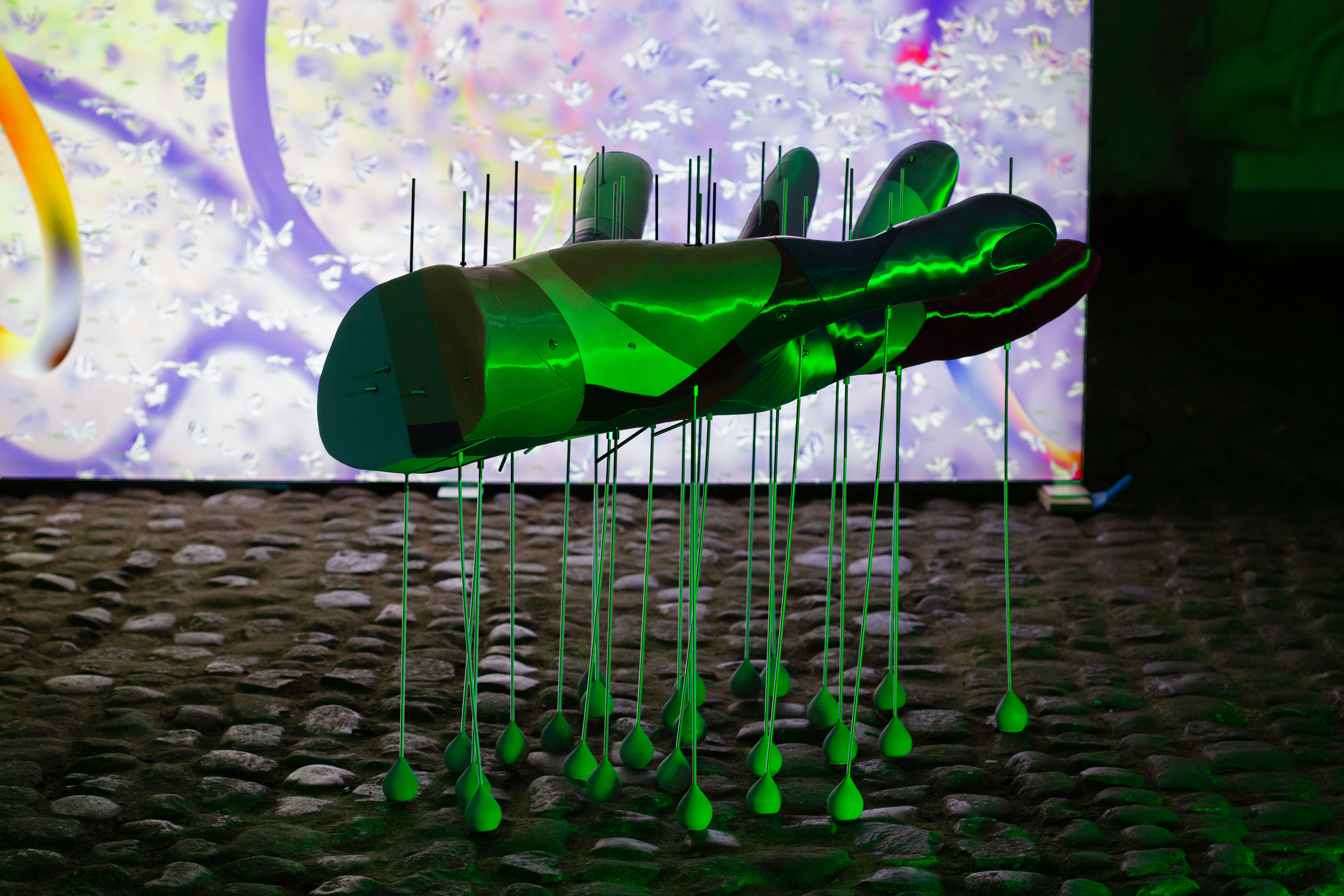 The exhibition draws upon the book "A Cyborg Manifesto,” from 1985 by American scholar and author Donna Haraway. Here she describes technology as a means to dissolve classic oppositions in Western life, such as human/technology and nature/culture. It no longer makes sense to view the digital and physical worlds, or nature and culture, as separate domains. This vision is realized in Wang & Söderström’s work. They are able to combine our sensory experiences in the physical world with our digital experiences - brining Haraway’s vision to life. - curator Majken Overgaard.