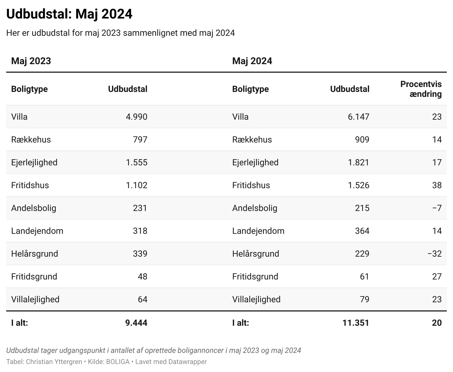 Samlet set er antallet af boliger til salg steget fra 9444 i maj 2023 til 11351 i maj 2024, hvilket svarer til en procentvis stigning på 20%.