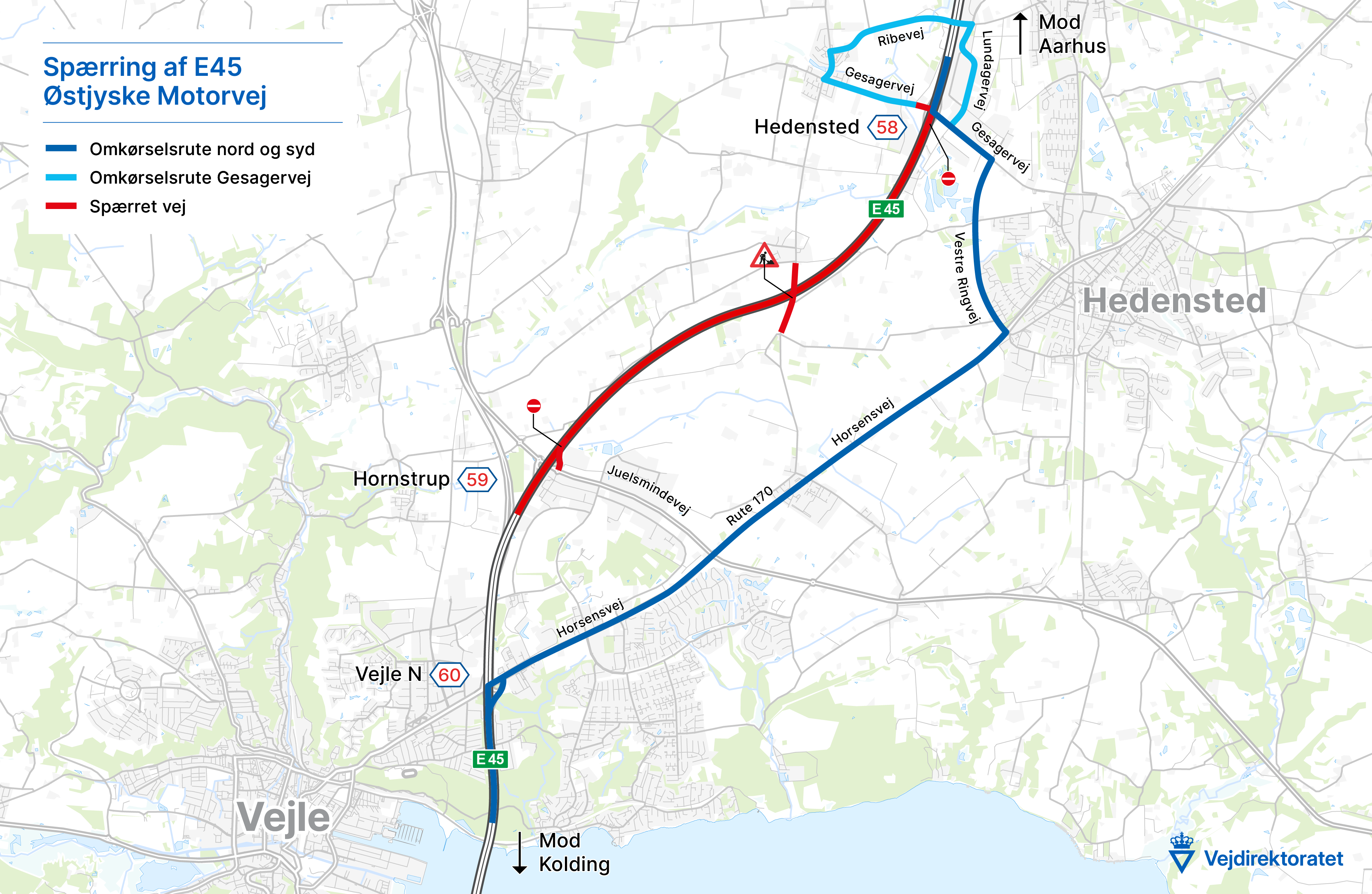E45 Østjyske Motorvej er spærret i begge retninger fra lørdag den 22. juni kl. 17.00 til søndag den 23. juni kl. 09.00 mellem afkørsel <59> Hornstrup og <58> Hedensted