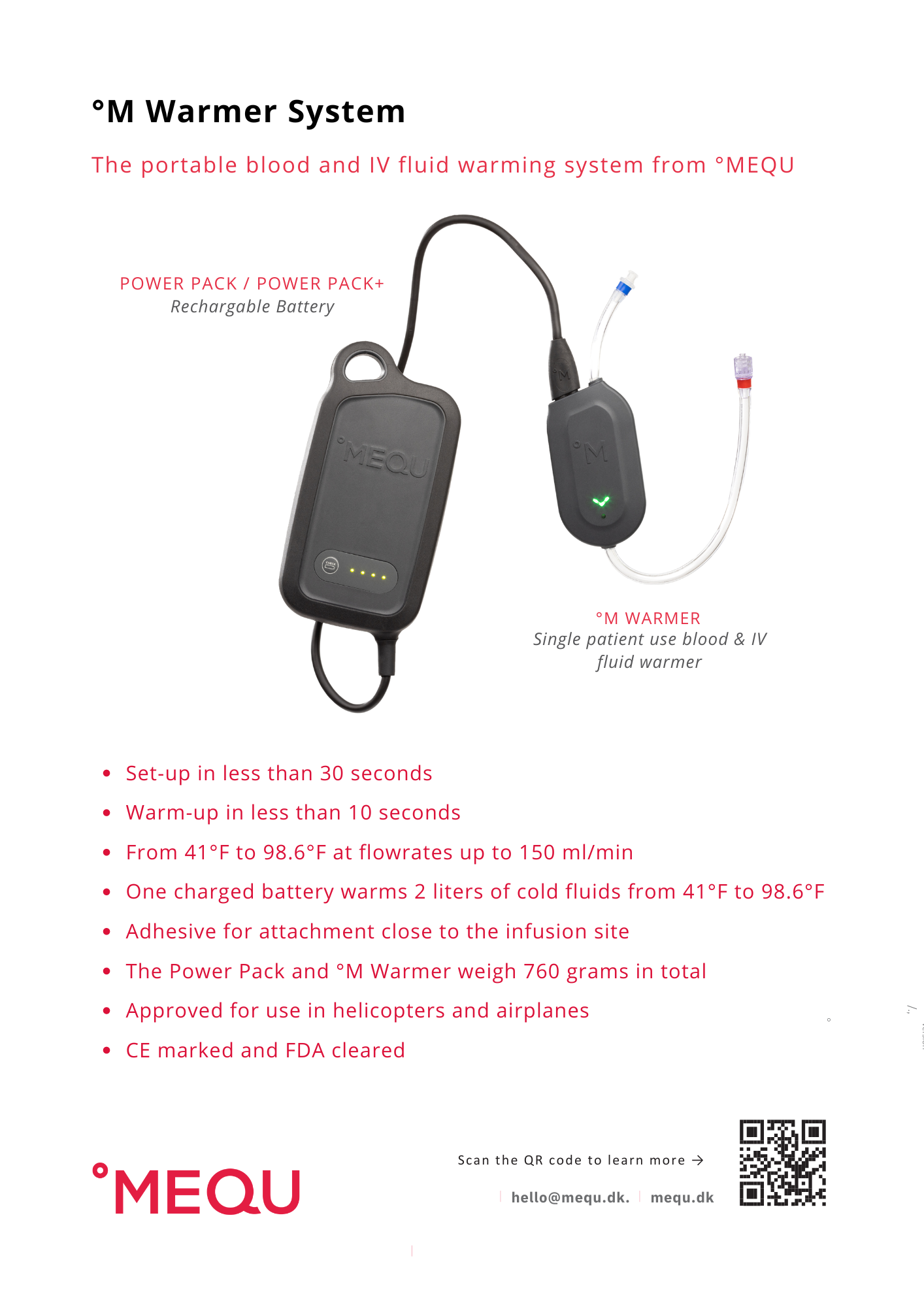 Det patenterede °M Warmer Systems bærbare og brugervenlige design muliggør opvarmningen af blod og IV væsker til kropstemperatur, uanset hvor behovet opstår, fra ulykkesstedet, under transport og på hospitalet - hvormed risikoen for hypotermi hos blødende patienter reduceres. °M Warmer Systemet blev oprindeligt udviklet i samarbejde med det danske forsvar og Danmarks Tekniske Universitet (DTU) for at reducere hypotermi og øge chancerne for overlevelse hos alvorligt tilskadekomne patienter. °M Warmer Systemet lever op til de amerikanske militære retningslinjer for traumelivsstøtte i kampmedicin (TCCC guidelines), der fremhæver brugen af batteri-drevne varme enheder til at opvarme blod og IV væske for at reducere risikoen for hypotermi.[1]