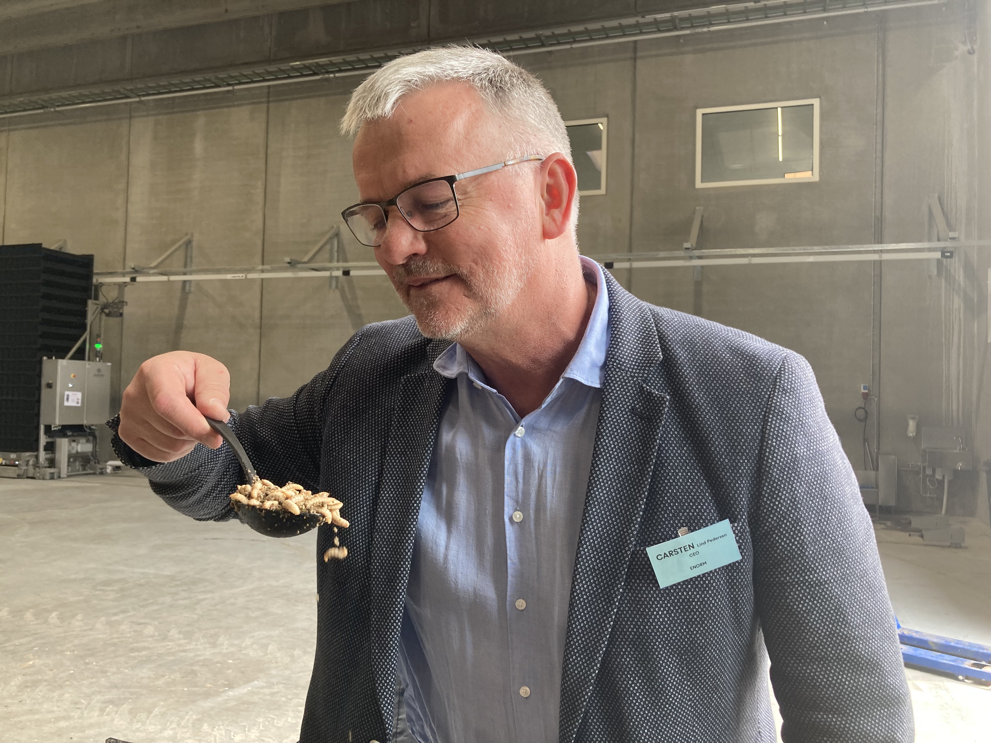 ENORM Factory A/S producerer godt 36.500 ton fluelarver, 2500 ton insektolie og 11.000 ton insektproteinmel om året. Lige nu bliver det brugt i blandt andet dyrefoder, men den ene af de to direktører i virksomheden, Carsten Lind Pedersen, er sikker på, at det kun er et spørgsmål om tid, før det bliver brugt i menneskemad.