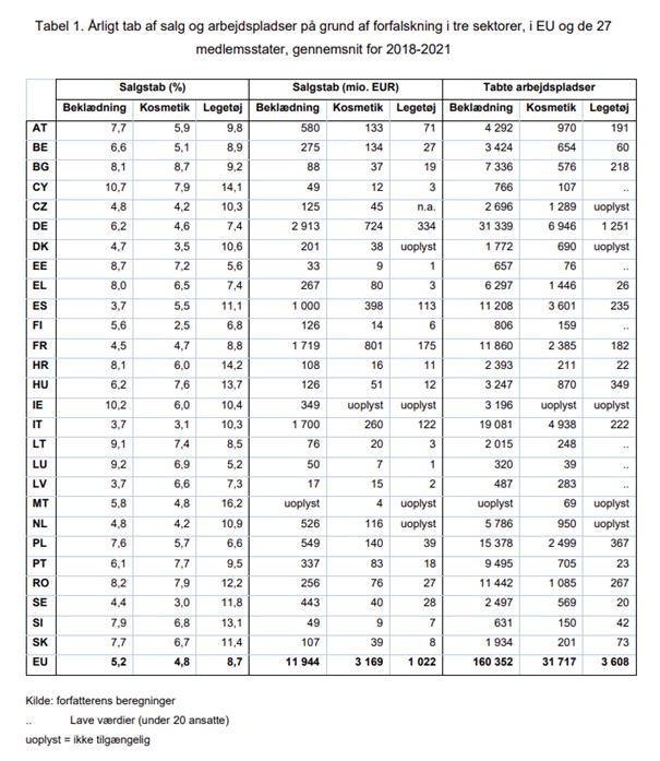 Forfalsket tøj, kosmetik og legetøj koster producenterne knap 1,8 milliarder kroner og knap 2.500 arbejdspladser på det danske marked. Tøjindustrien er den branche, der lider det største tab på grund af forfalskede varer med et anslået tab på knap 1,5 milliarder kroner om året (4,7 % af salget) i Danmark.