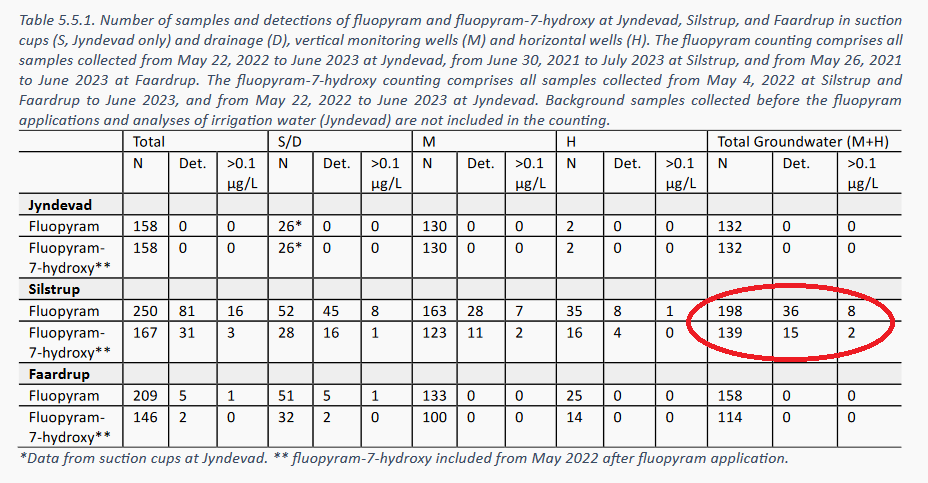 Blandt de konstaterede forureninger af grundvandet er der for 2. periode i træk gjort fund af PFAS-giften fluopyram (et svampemiddel) og dets nedbrydningsprodukt fluopyram-7-hydroxy i koncentrationer, der overskrider kravværdien for pesticider i grundvand. Alligevel kan landbruget fortsætte med at bruge den populære sprøjtegift, så længe ”de årlige gennemsnit af målingerne vurderes ikke at overskride kravværdien,” skriver Miljøstyrelsen i sin pressemeddelelse 30. maj 2024.