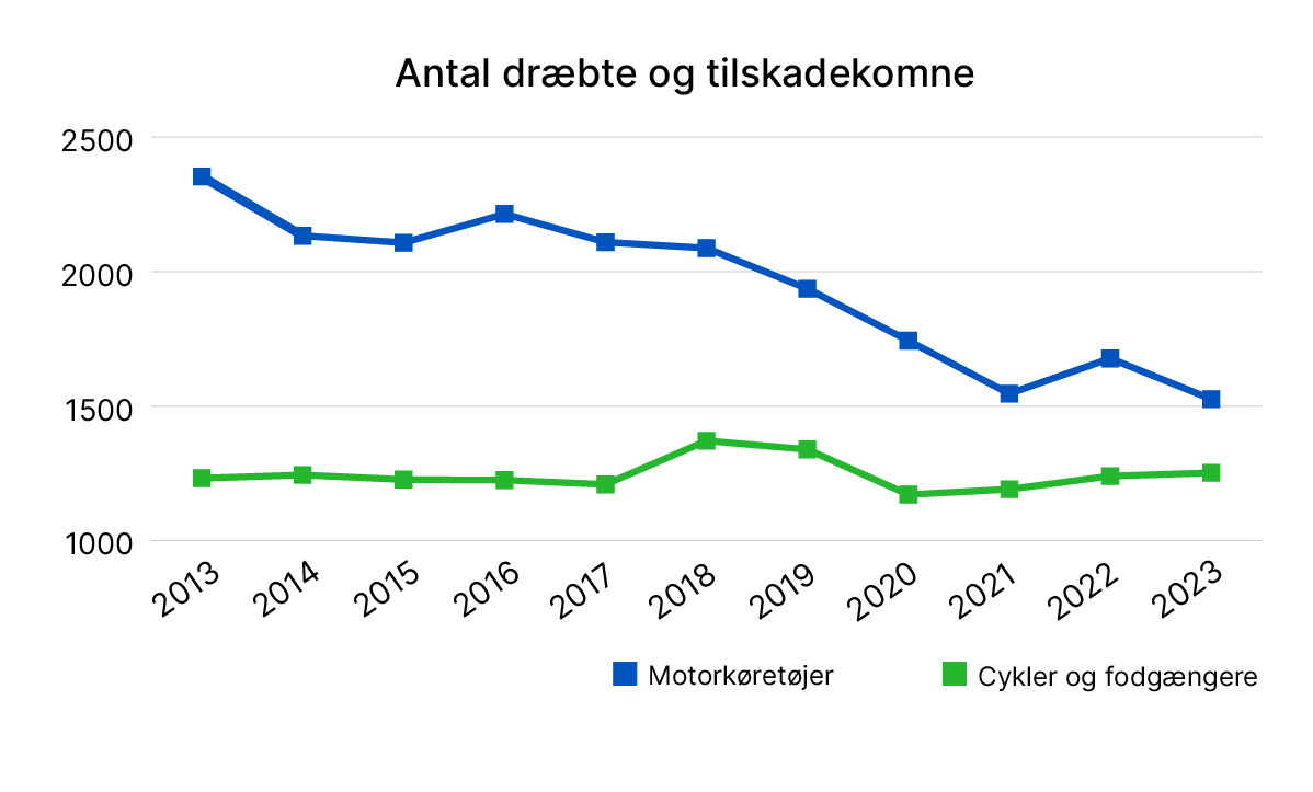Tallene i den nye rapport fra Vejdirektoratet viser, at det siden 2013 er blevet markant mere sikkert at være bilist. I den samme 10-årige periode har det dog vist sig sværere at knække kurven over antal dræbte og tilskadekomne cyklister og fodgængere, for udviklingen for cyklister og fodgængere er stort set status quo i 2023 sammenlignet med 10 år tidligere.