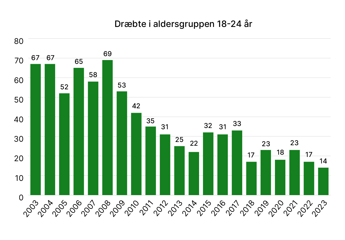 14 ud af de i alt 162 personer, der mistede livet i trafikken i 2023, var mellem 18 og 24 år. Dette er det laveste antal, der er registreret i den tid, der er ført statistik over dræbte i trafikken.