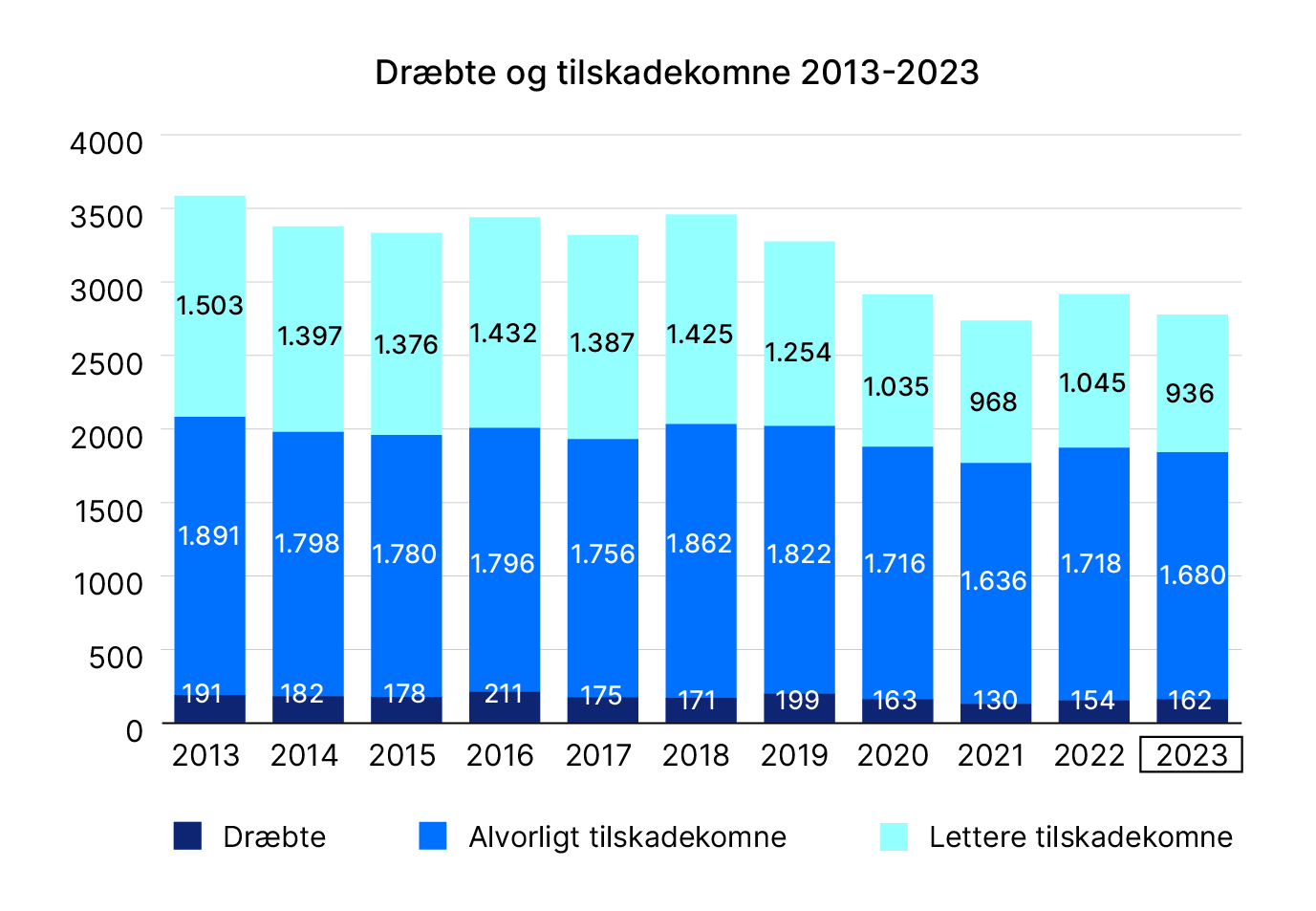 De tilskadekomne i 2023 fordeler sig på 1.680 alvorligt tilskadekomne og 936 lettere tilskadekomne. Det samlede fald i antal tilskadekomne skyldes primært et markant lavere antal af lettere tilskadekomne.