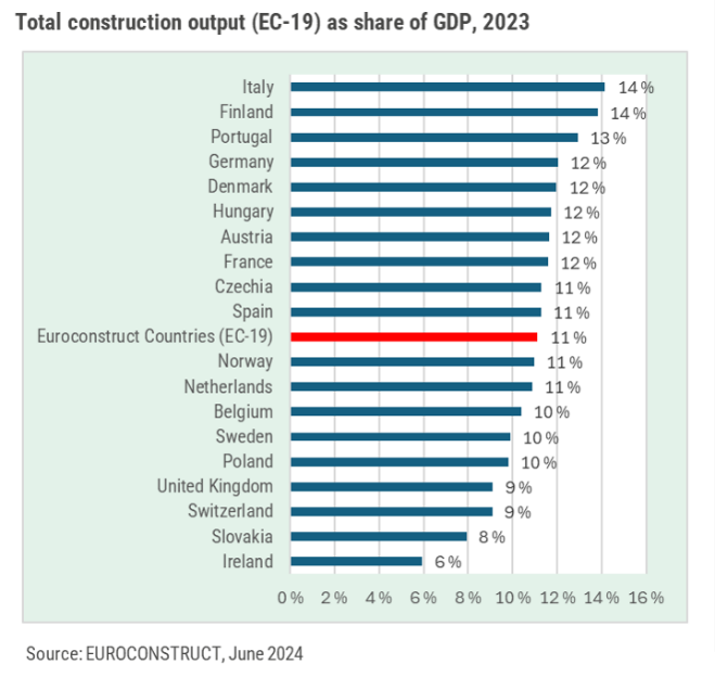 På grund af deres meget forskellige størrelser (befolkning, økonomisk styrke) varierer de nominelle byggevolumener i de 19 lande fra omkring EUR 10 mia. til næsten EUR 500 mia. Når produktionsværdien sættes i forhold til BNP, er spredningen betydeligt mindre. I 2023 var gennemsnittet 11 procent. I Italien udgjorde andelen af byggeri i den økonomiske produktion dog 14 procent.