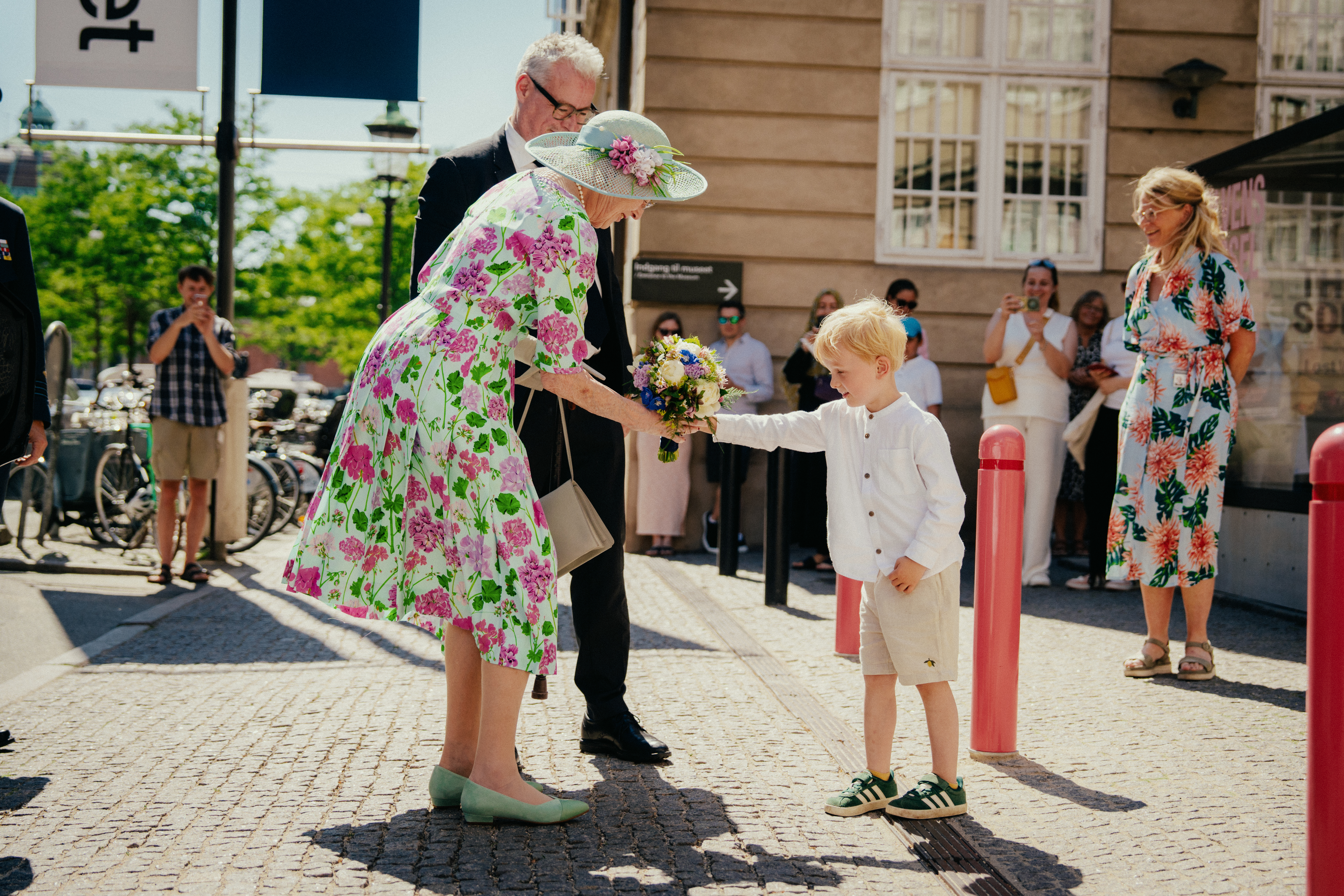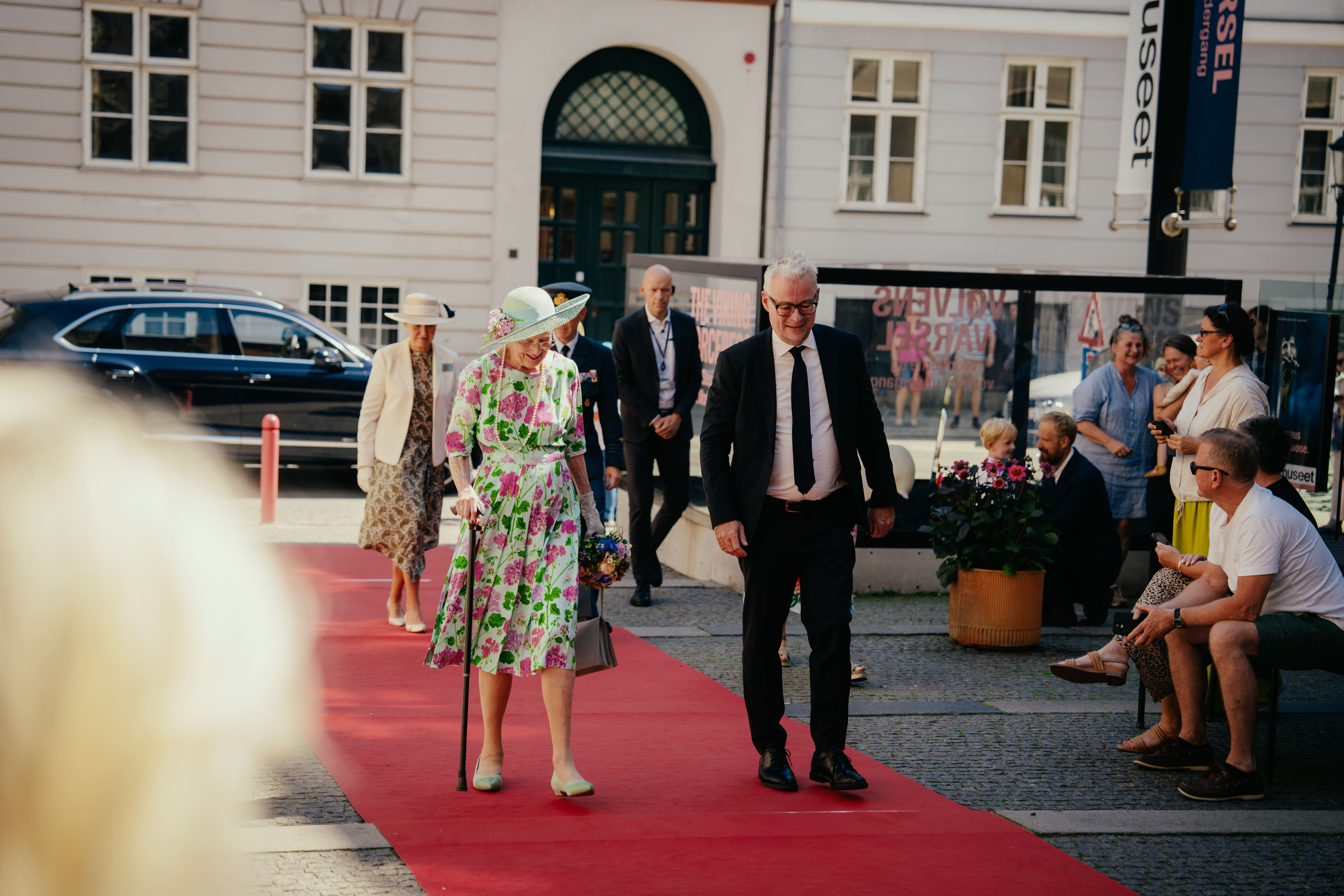 Kl. 15.00: H.M. Dronningen og følge ankommer. Nationalmuseets direktør Rane Willerslev og blomsterdreng tager imod H.M. Dronningen.